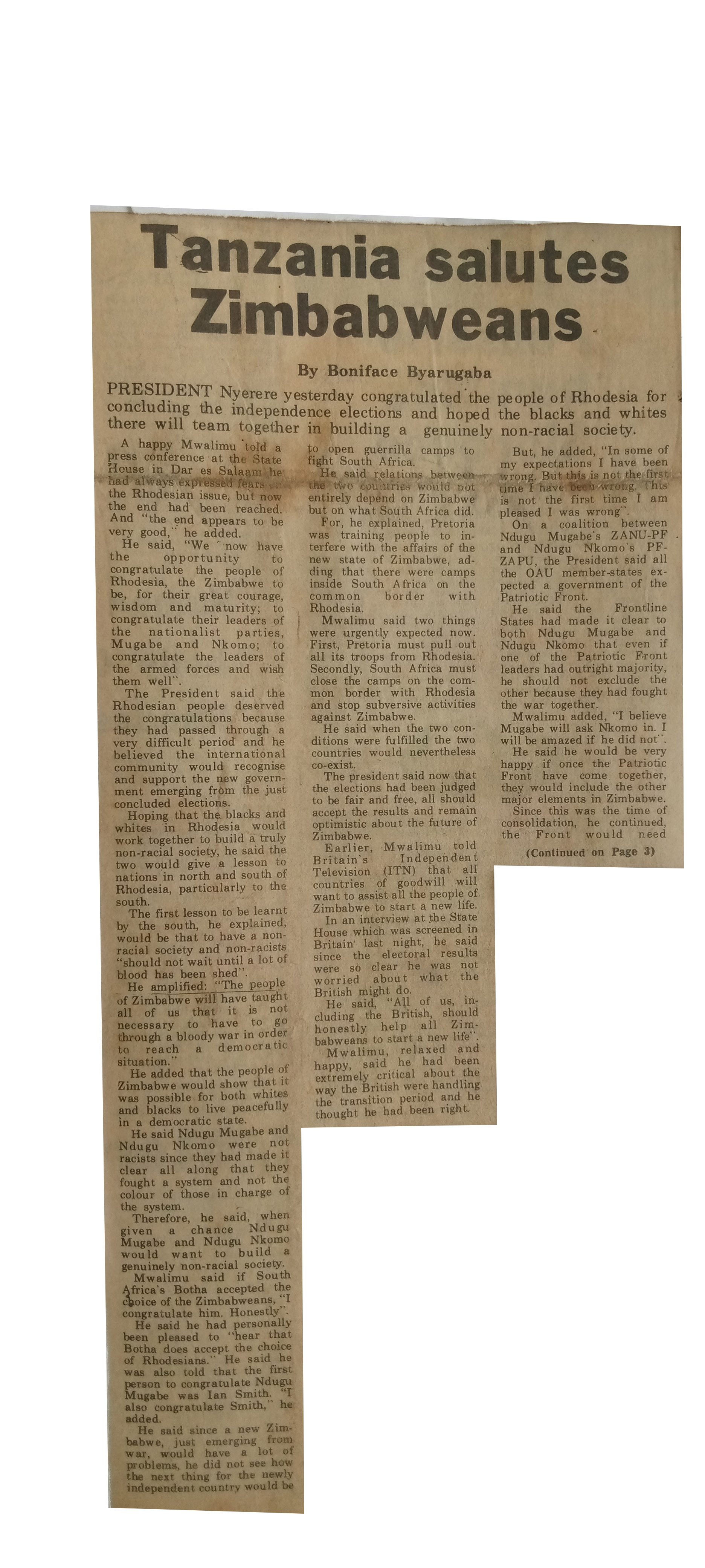 Tanzania salutes Zimbabweans (1980,March 5) Daily News.pp.1