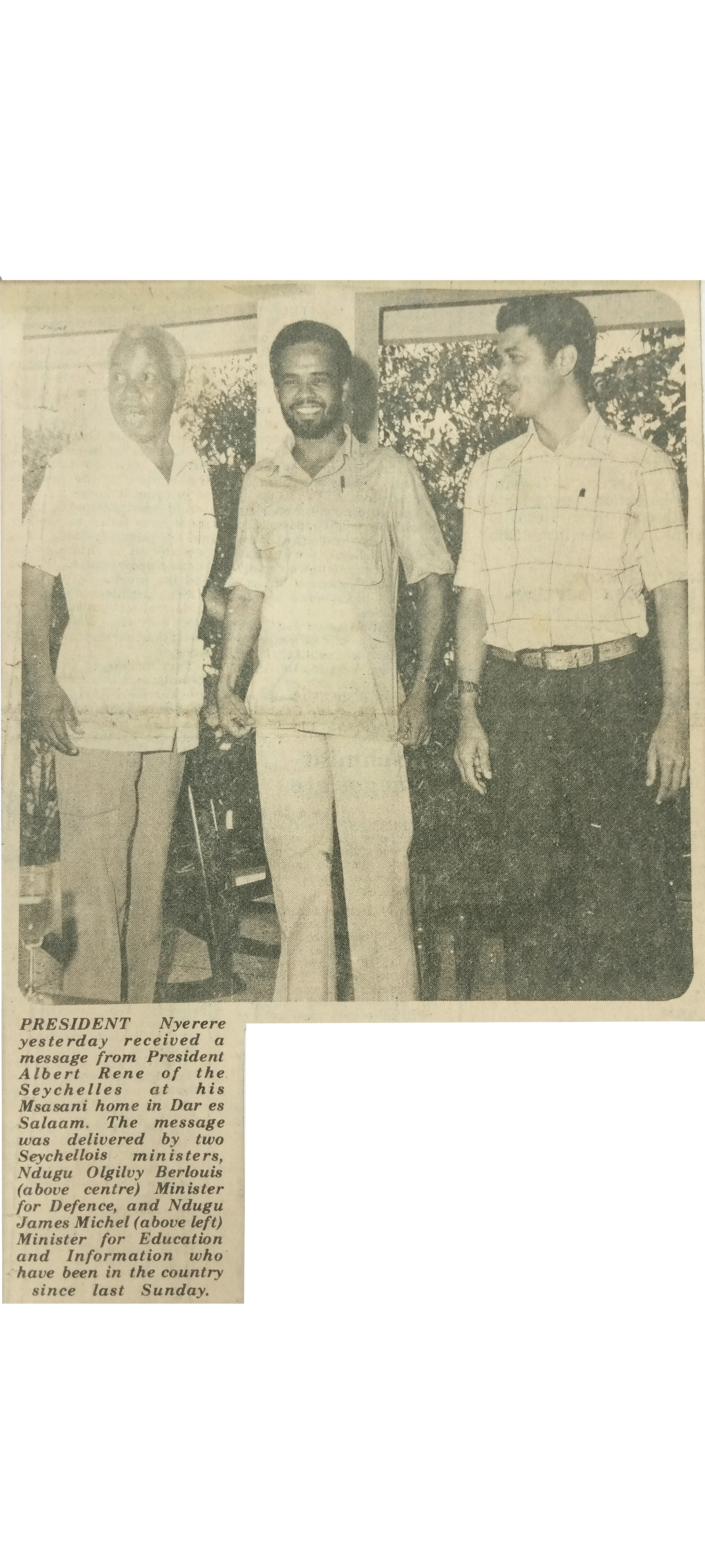 Mwalimu Nyerere with Seychellois ministries ndugu Olgilvery Berlouis(above center) Minister for defence and ndugu James Michael(above left) minister of education and information