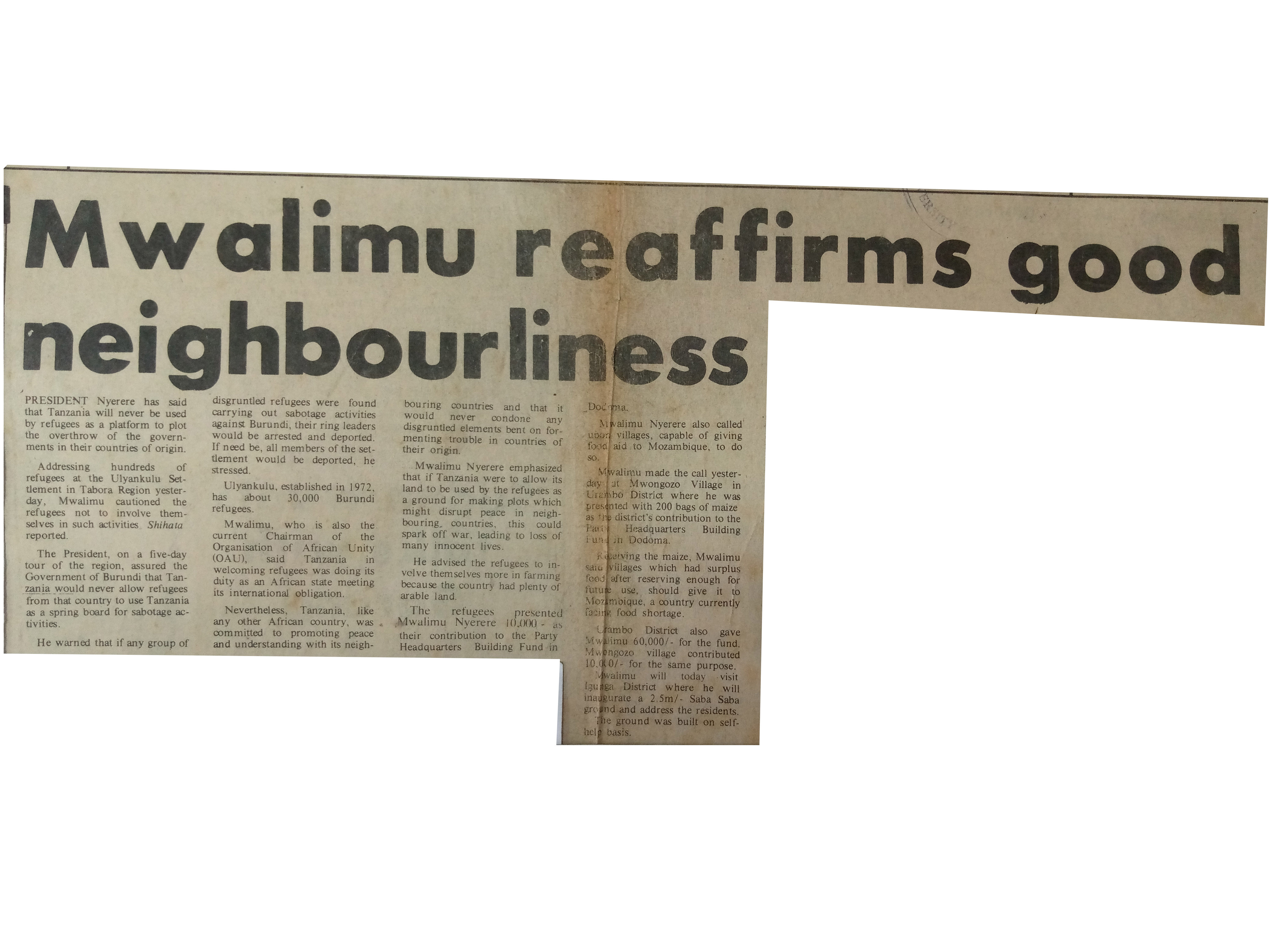 Mwalimu reaffirms good neighbourliness(1985,June 18) Daily News,pp.1