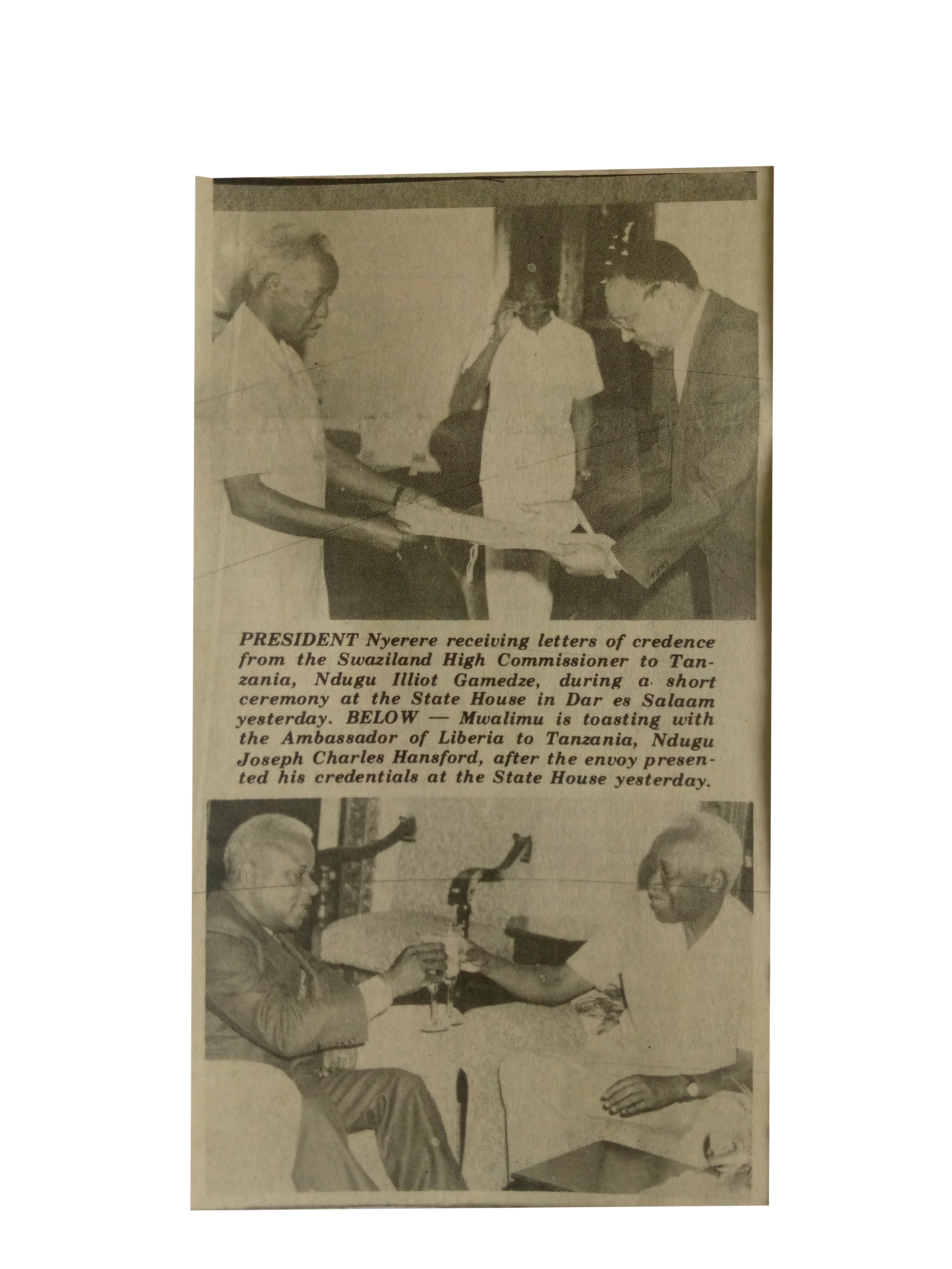 President Nyerere receiving letters of credence from the Swaziland high Commissioner to Tanzania (1985,August 7) Daily News.pp.3