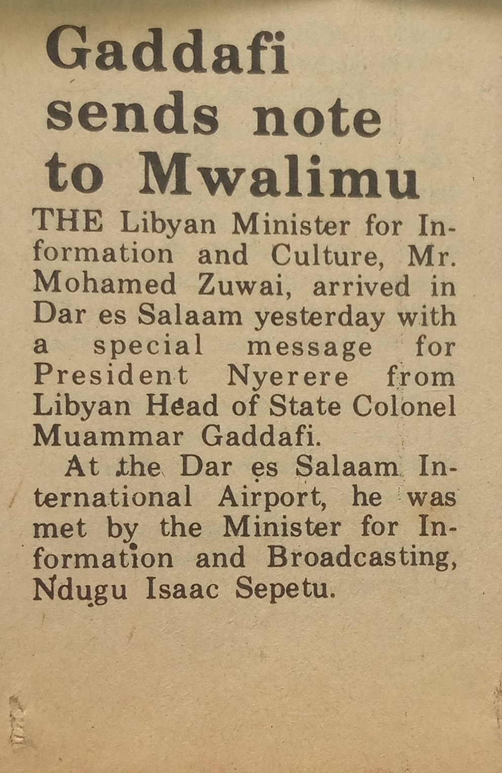 Gaddafi sends note to Mwalimu (1978, November 7 Daily News,pp.1