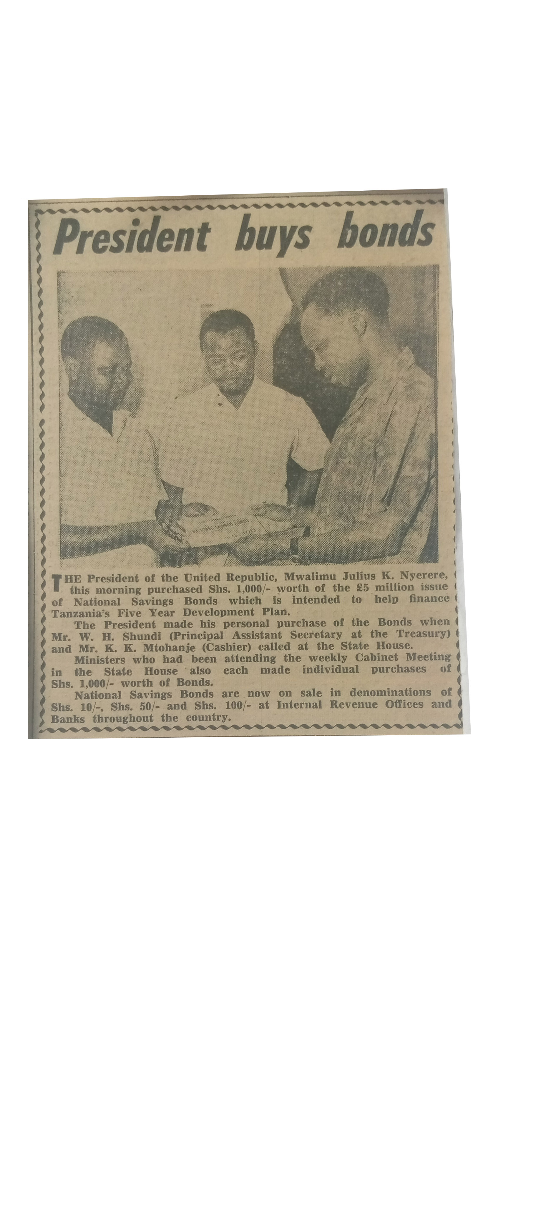 The President of the United Republic, Mwalimu Julius K. Nyerere purchased Shs.1000/-worth of the 25 million issue of the national savings bonds which is intended to herlp finance Tanzanian's five year development plan.