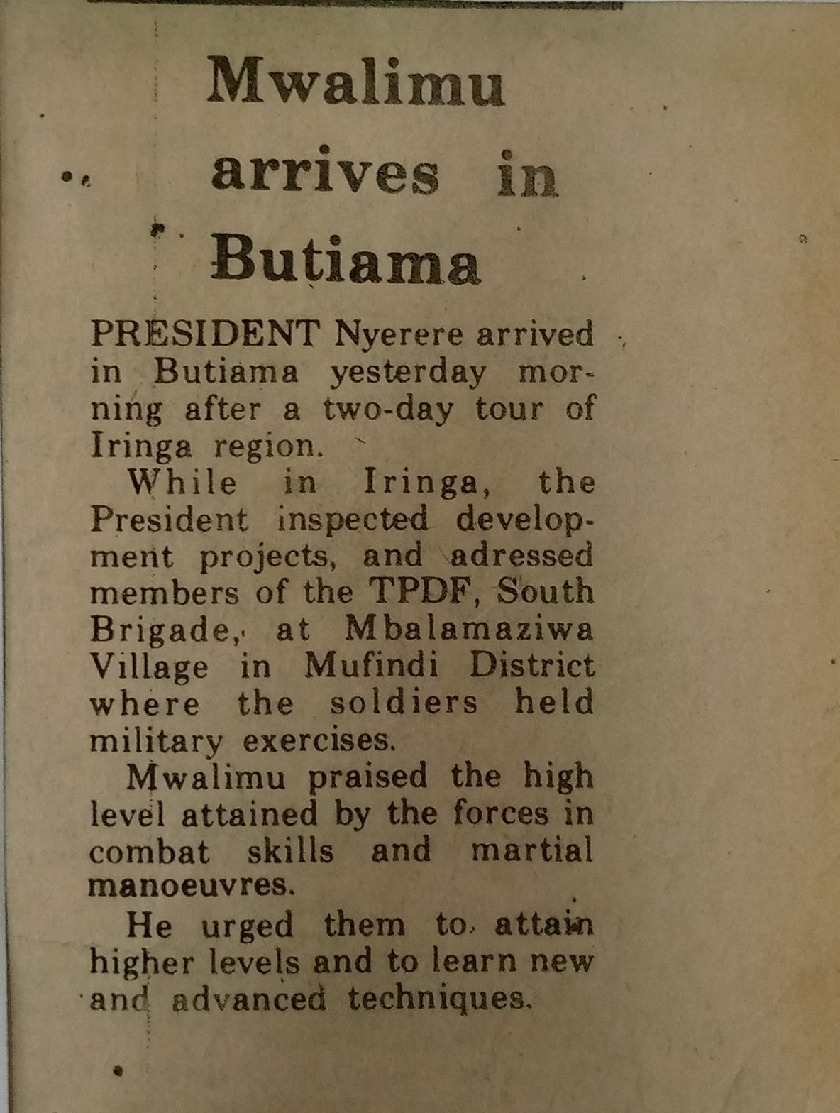 | dc.description.abstract | President Nyerere arrived in Butiama yesterday morning after a two-day tour of Iringa region. | en_US |