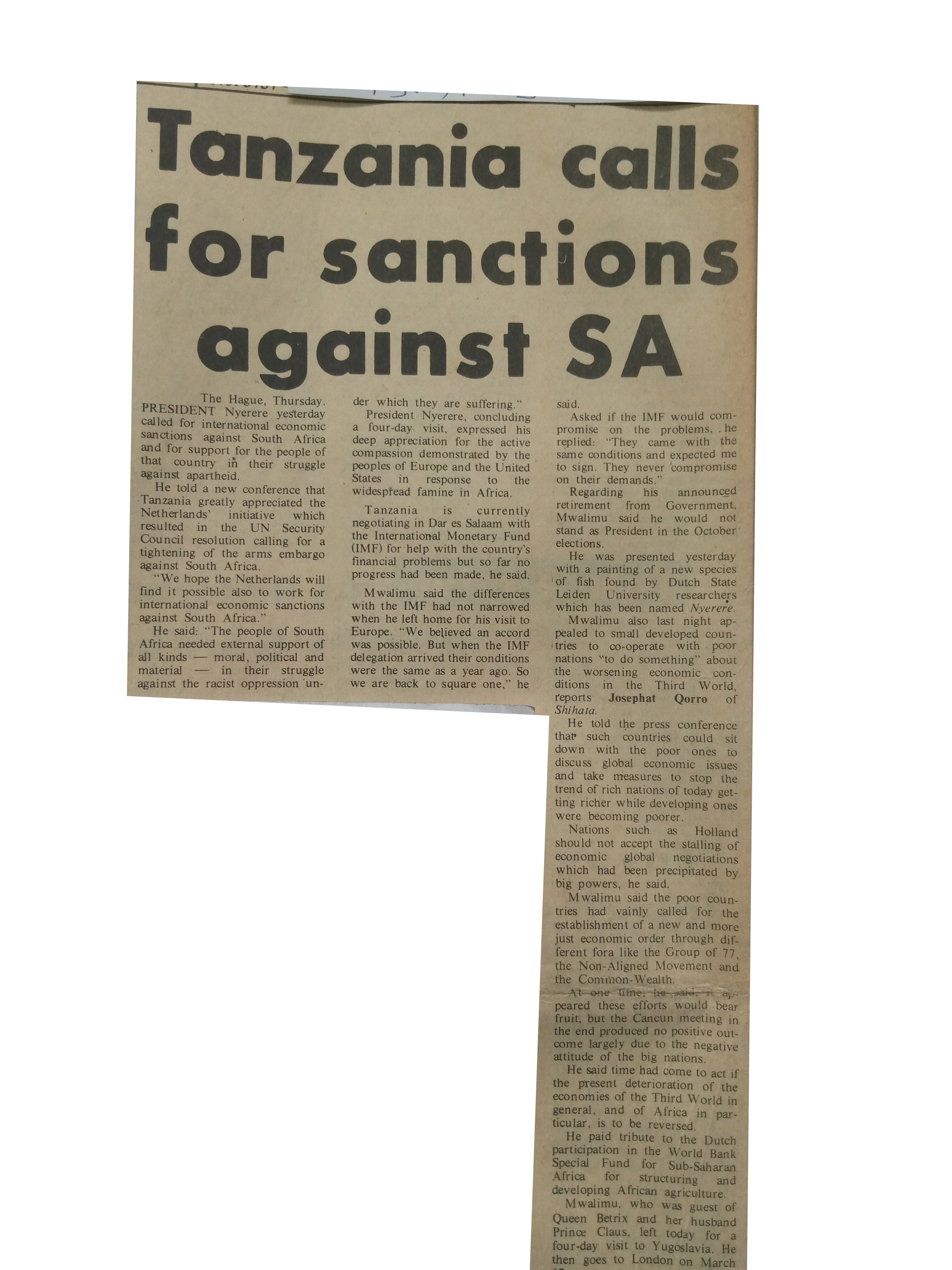 Tanzania calls for sanctions against SA (1985, March 15). Daily News, pp.1