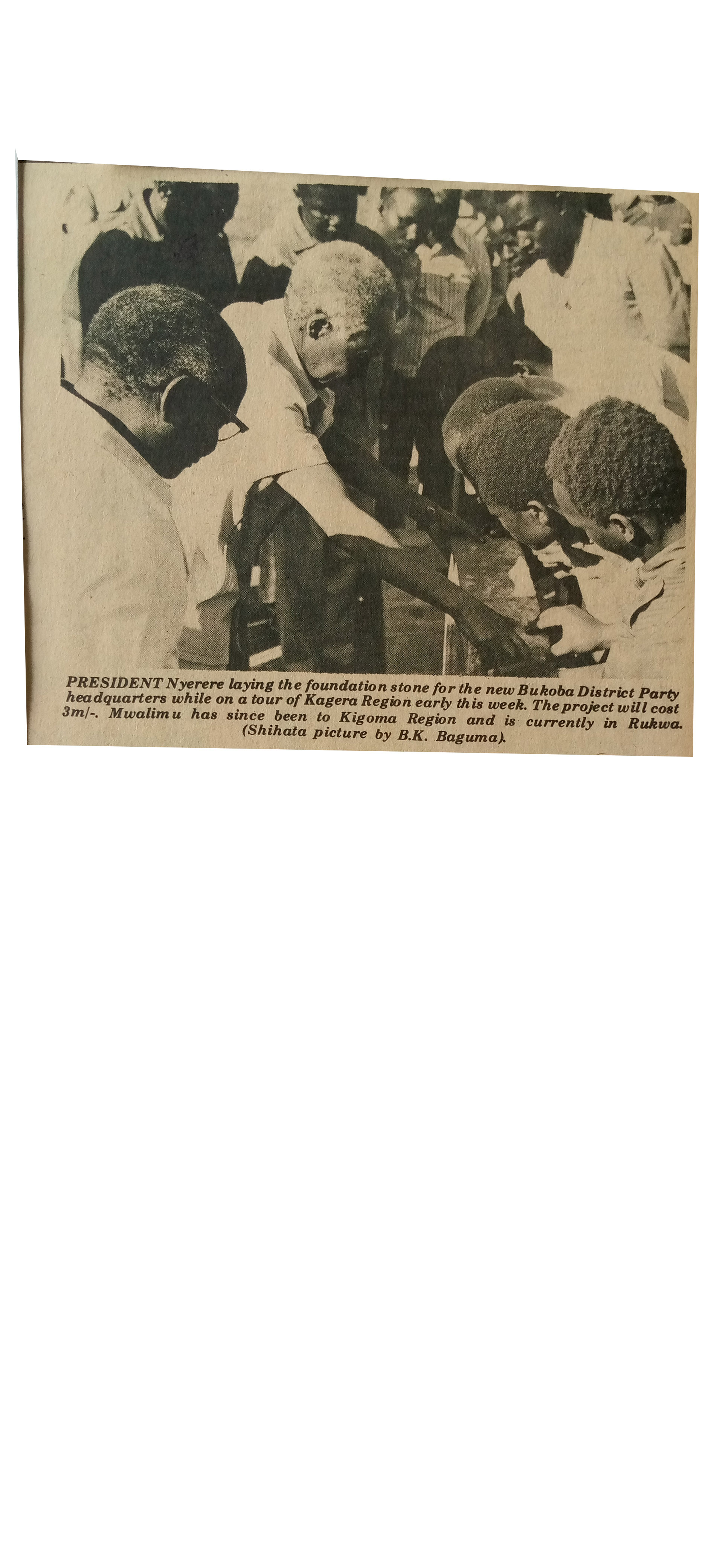 President Nyerere laying the foundation stone for the new Bukoba District Party headquarters