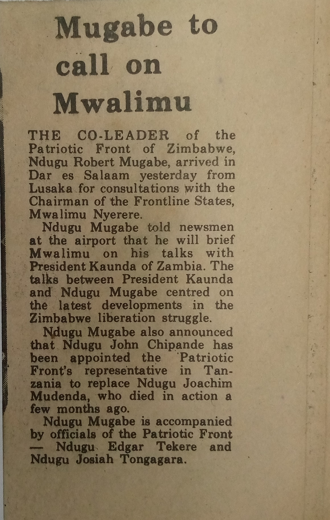 | dc.description.abstract | The co-leader of the patriotic front of Zimbabwe,Ndugu Robert Mugabe,arrived in Dar es Salaam yesterday from Lusaka for consultations with the Chairman of the Front-line States,Mwalimu Nyerere. | en_US |