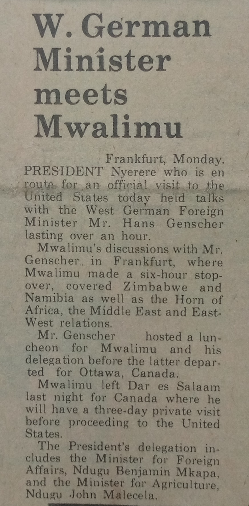 | dc.description.abstract | President Nyerere who is enroute for an official visit to the United States today held talks with the West German Foreign Minister Mr.Hans Genscher lasting over an hour. | en_US |