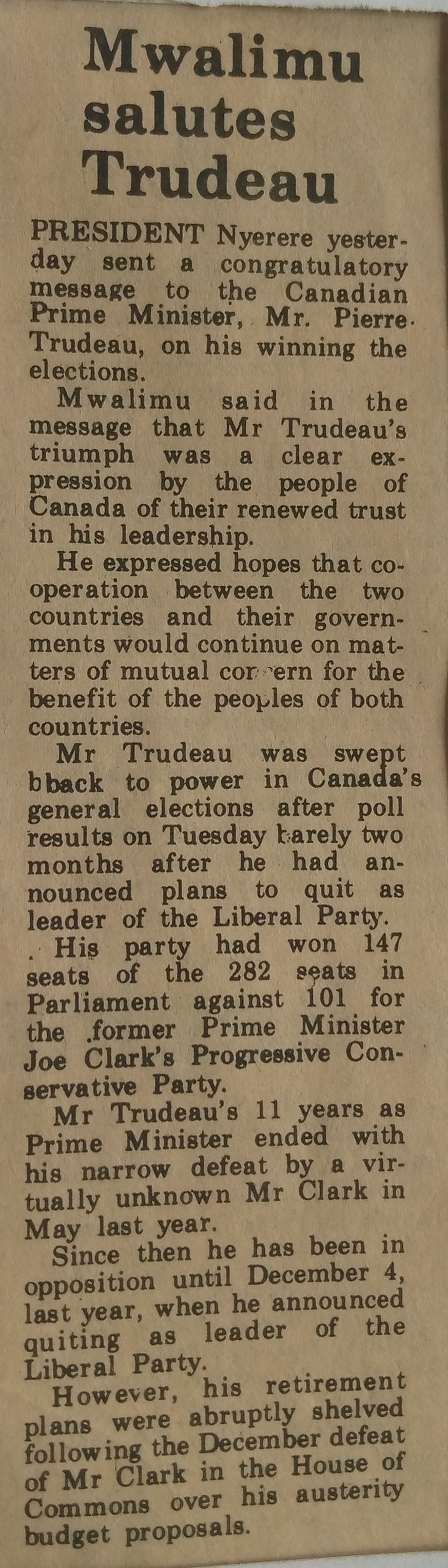 Mwalimu salutes Trudeau (1980,February 21) Daily News.pp.1