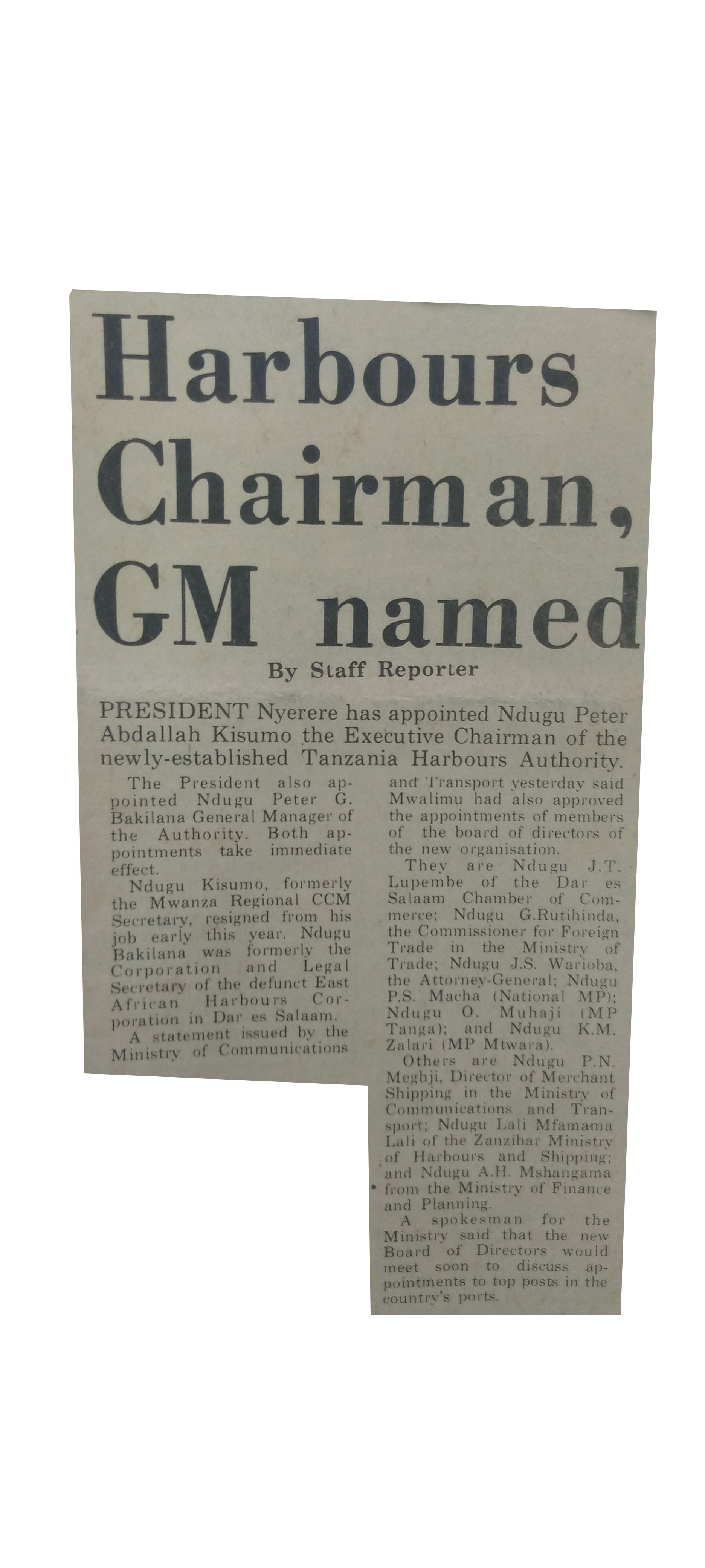 President Nyerere has appointed Ndugu Peter Abdllah Kisumo the Executive Chairman of the newly-established Tanzania Harbours Authority.