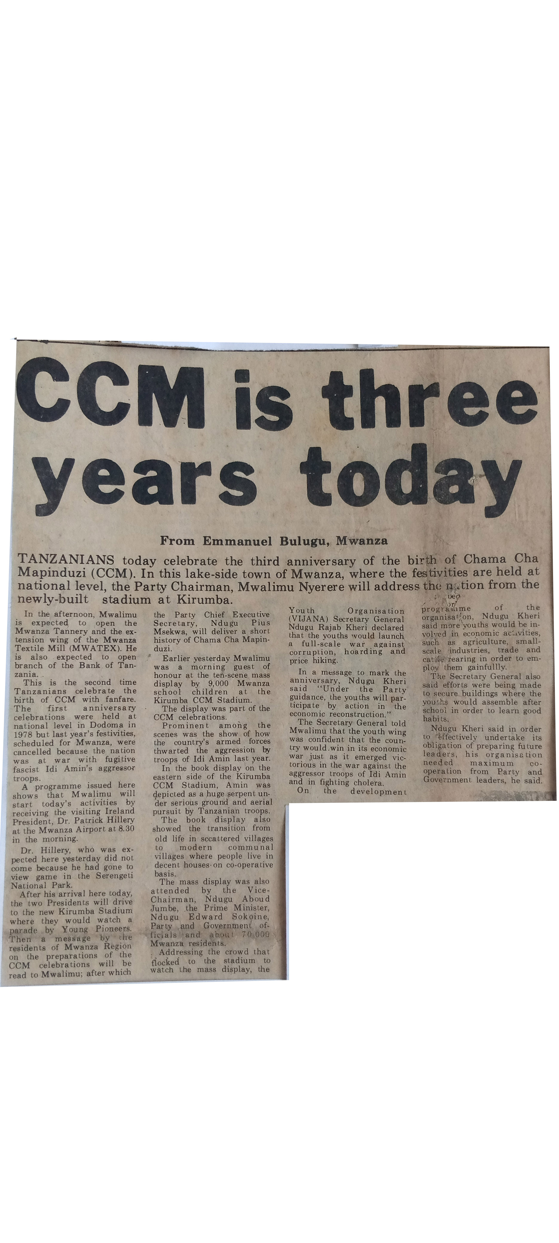 Tanzanians today celebrate the third anniversary of the birth of Chama Cha Mapinduzi(CCM). In this lake-side town of Mwanza,where the festivities are held at national level,the Party Chairman,Mwalimu Nyerere will address the nation from the newly-built stadium at kirumba.