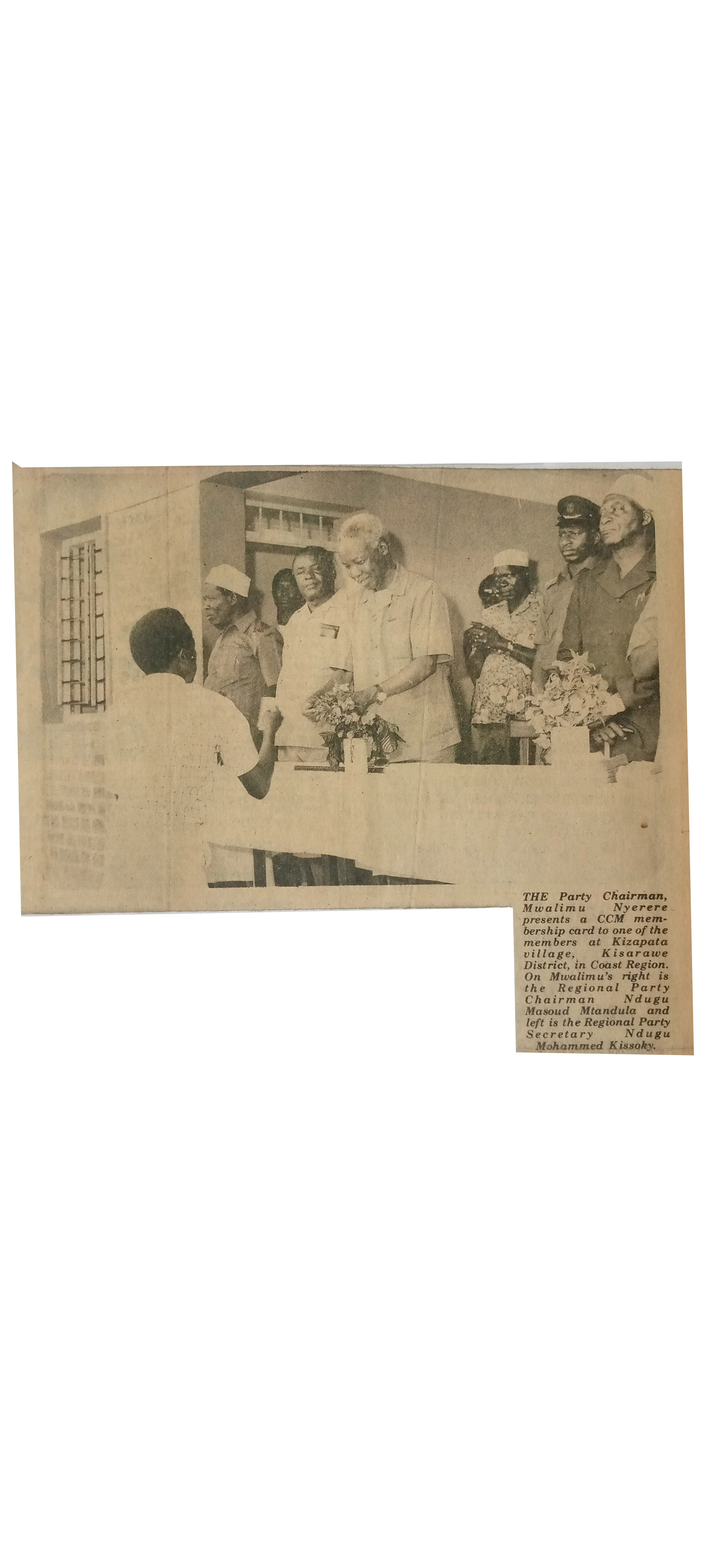 Nyerere J.K (1980 September 3). Mwalimu Nyerere presents a CCM membership card to one of the members at Kizapata, pp. 1