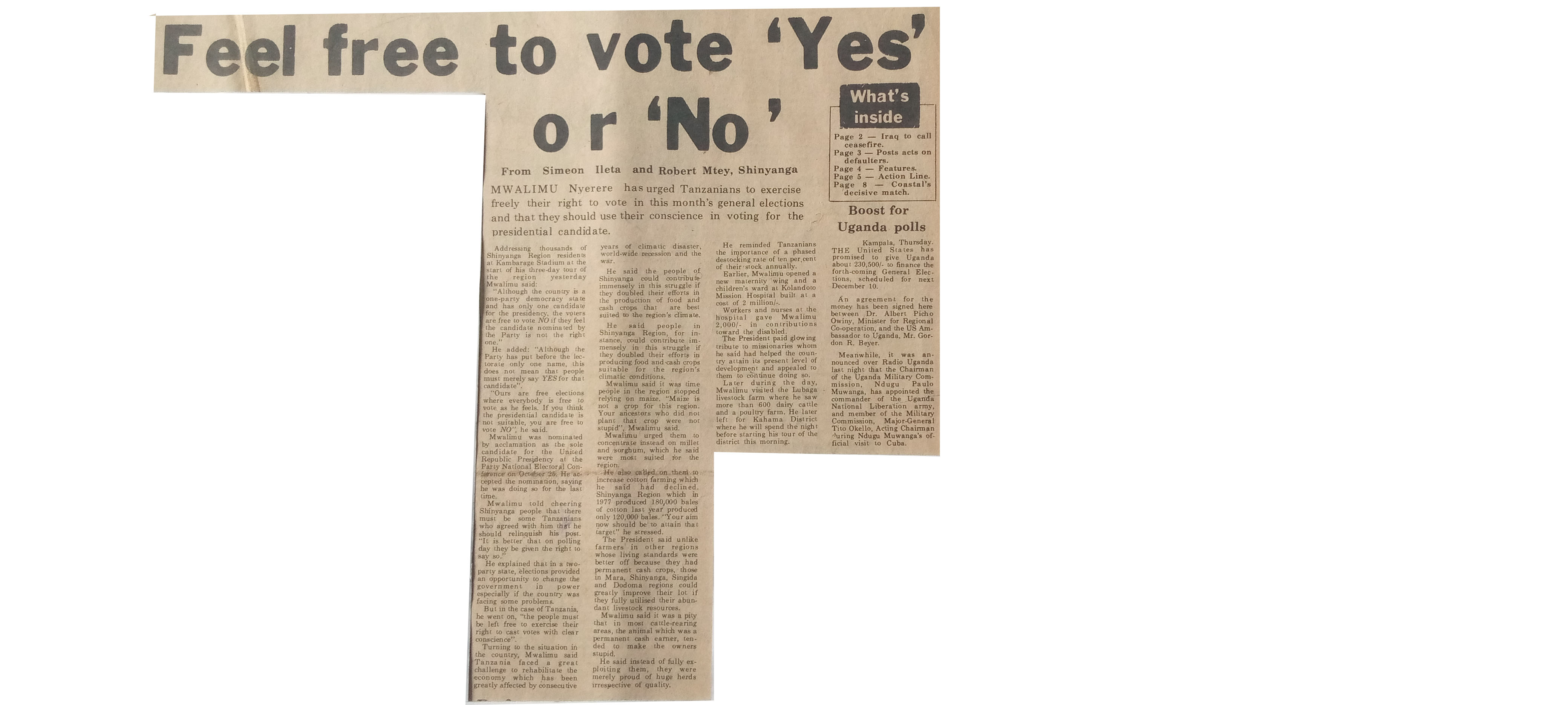 dc.description.abstract | Mwalimu Nyerere has urged Tanzanians to exercise freely their right to vote in this month's general elections and that they should use their conscience in voting for the presidential candidate. | en_US |