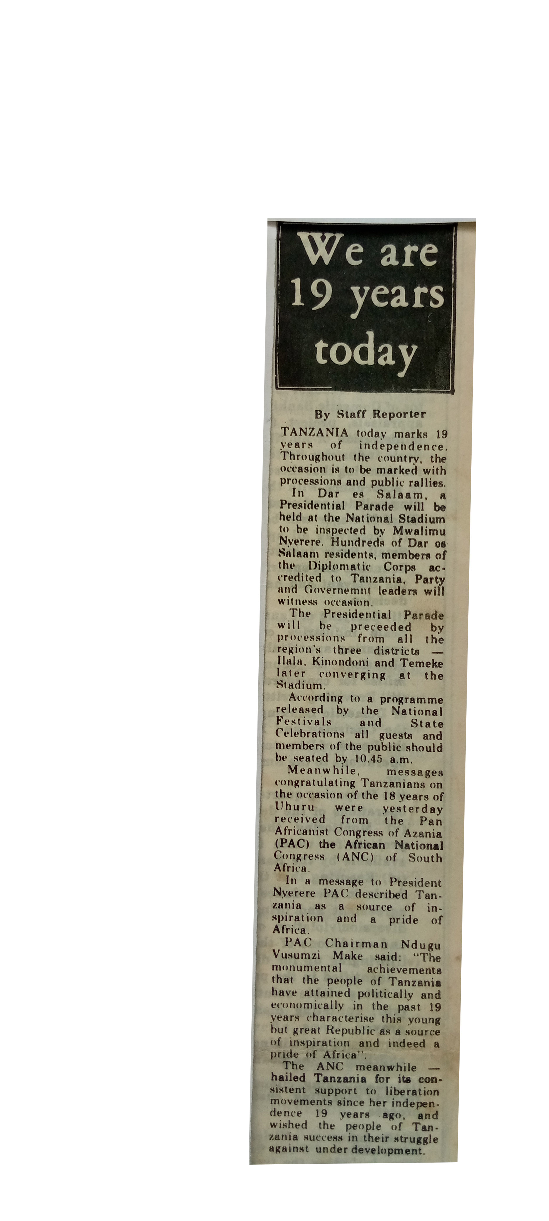 Tanzania today marks 19 years of independence .Throughout the country,the occasion is to be marked with processions and public rallies.