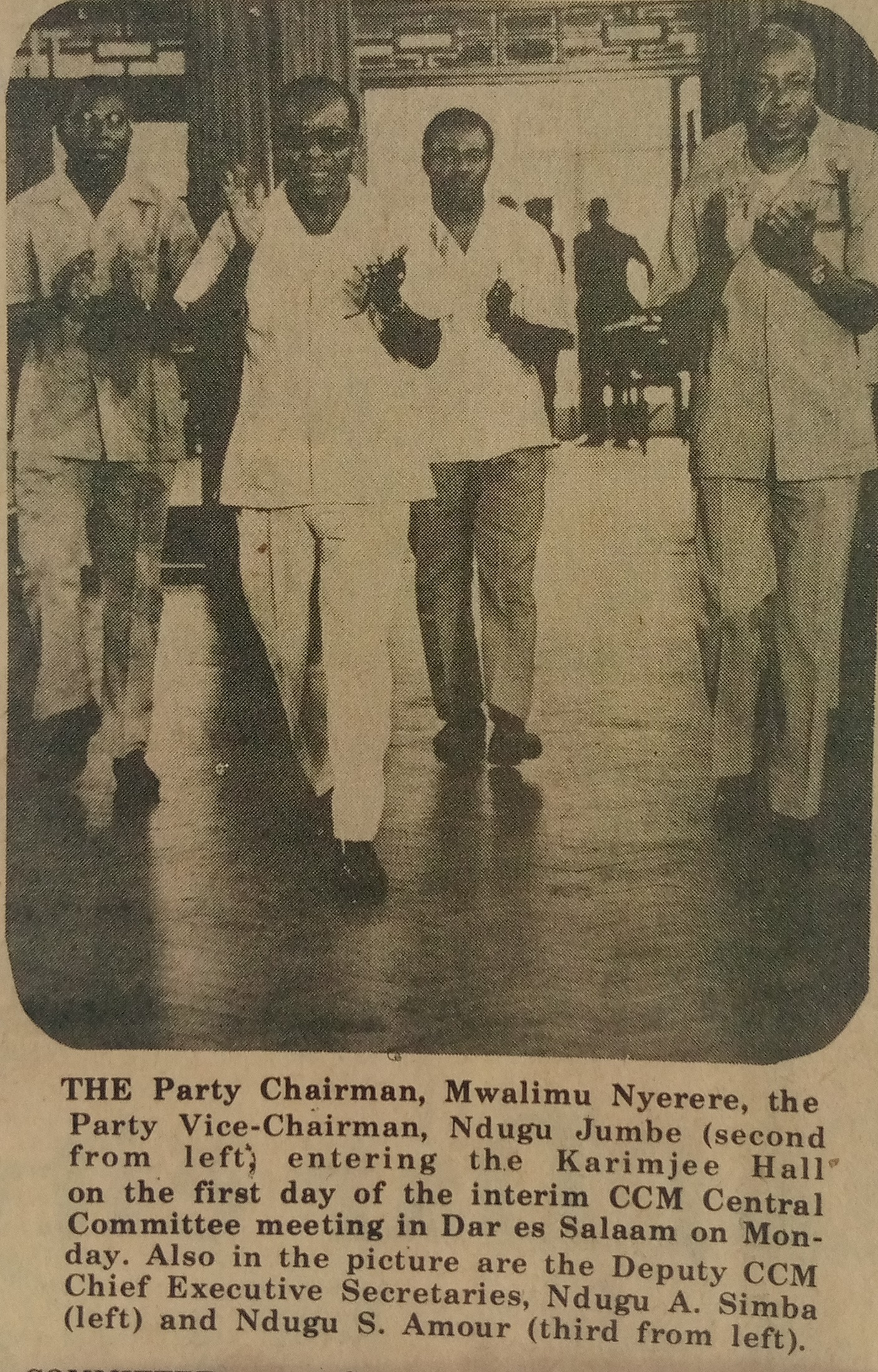The party Chairman, Mwalimu Nyerere the party Vice-Chairman,Ndugu Jumbe entering the Karimjee Hall on the first day of the interm CCM (1977,September 9) Daily News.pp.4