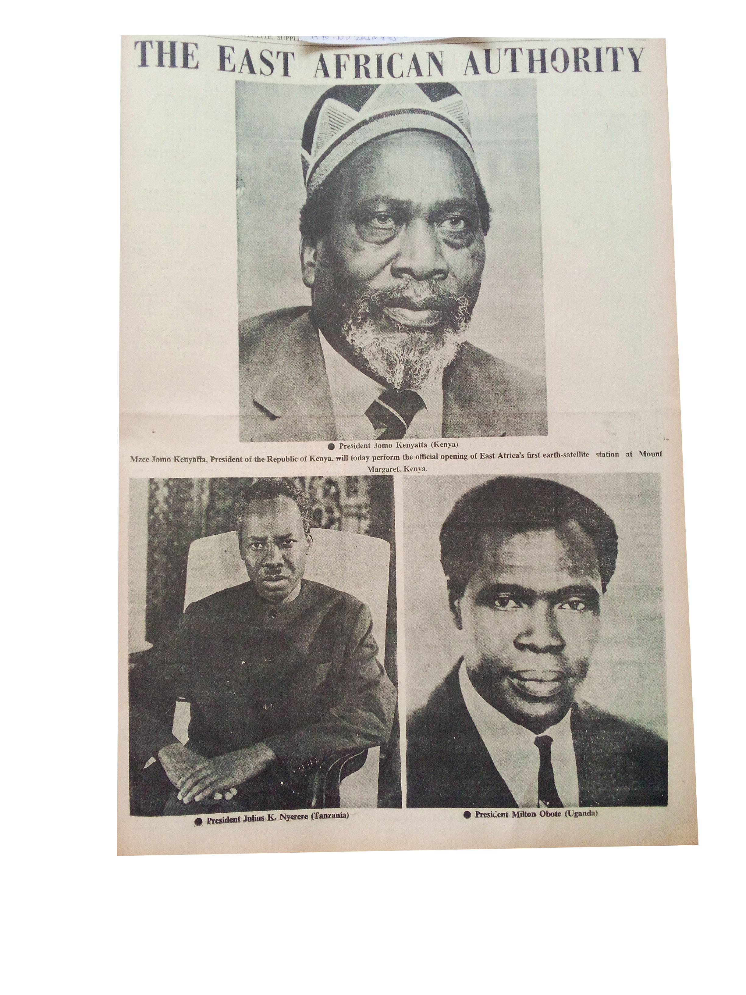 | dc.description.abstract | Mzee Jomo Kenyatta,President of the Republic of Kenya,will today perform the official opening of East Africa's first earth-satellite station at Mount Margaret,Kenya. | en_US |