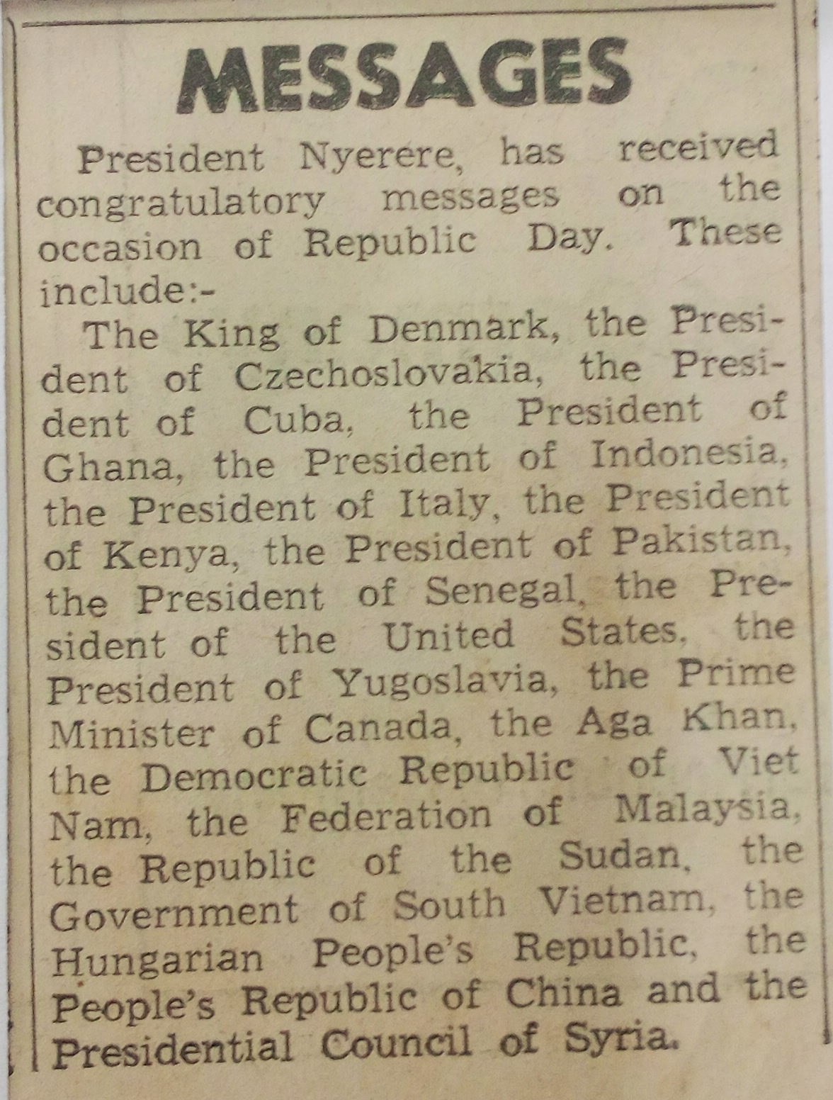 President Nyerere has received congratulatory messages on the occasion of Republic Day