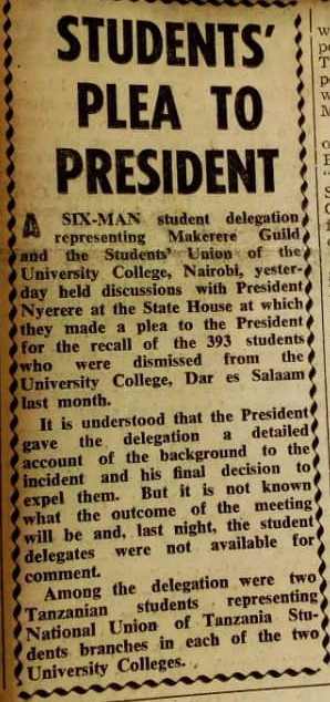 A six-man student delegation representing Makerere Guild and the student Union of the University College, Nairobi, held discussion with president for recall of 393 students who were dismissed from the university college, Dar es salaam