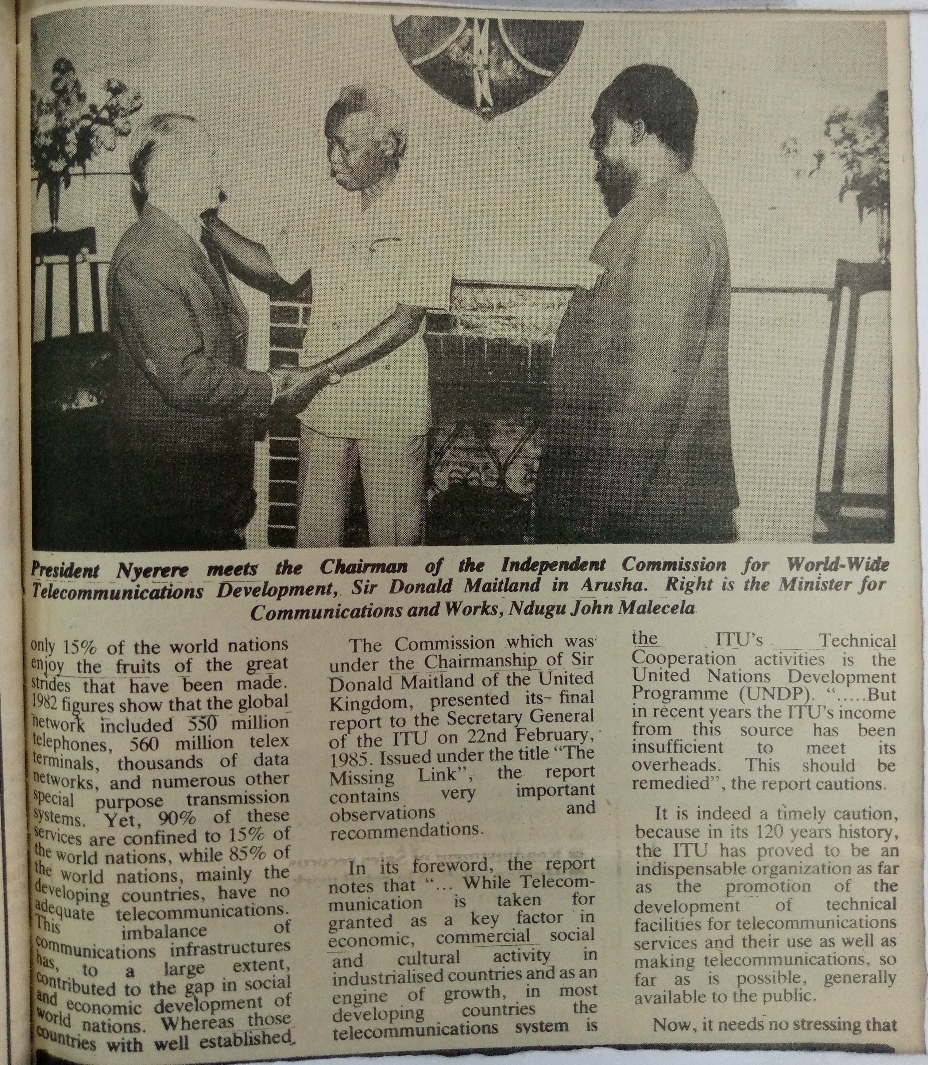 President Nyerere meets the chairman of the Independent commission for the World-Wide telecommunications development, sir Donald Maitland in Arusha.