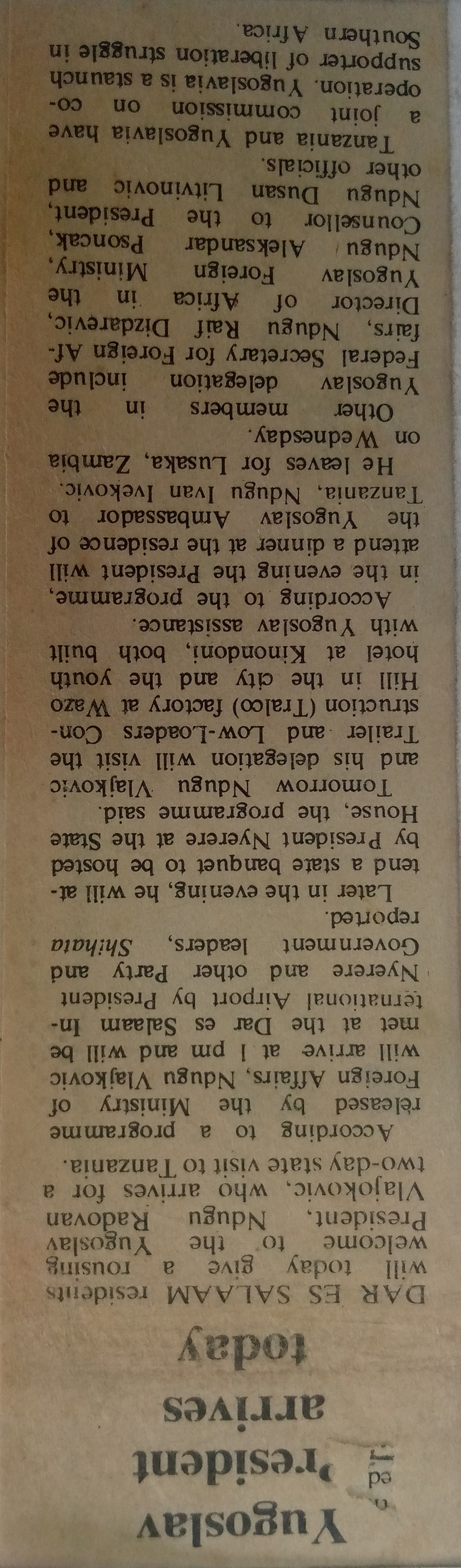 Yugoslav president arrives today (1985,July 1) Daily News.pp.1