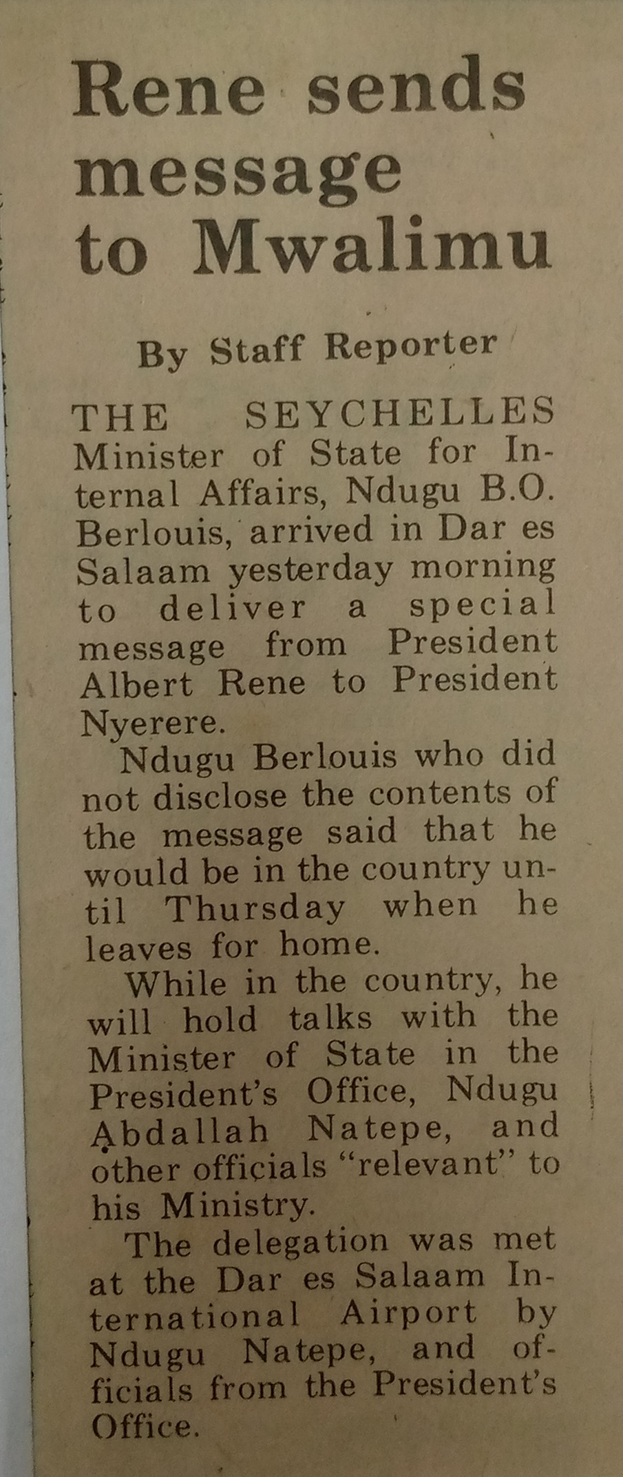 Rene send message to Mwalimu (1977, October 11). Daily News, pp.1