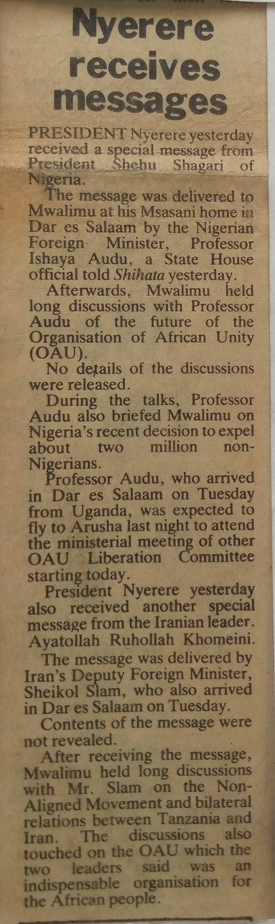 President Nyerere yesterday received a special message from President Shehu Shangari of Nigeria