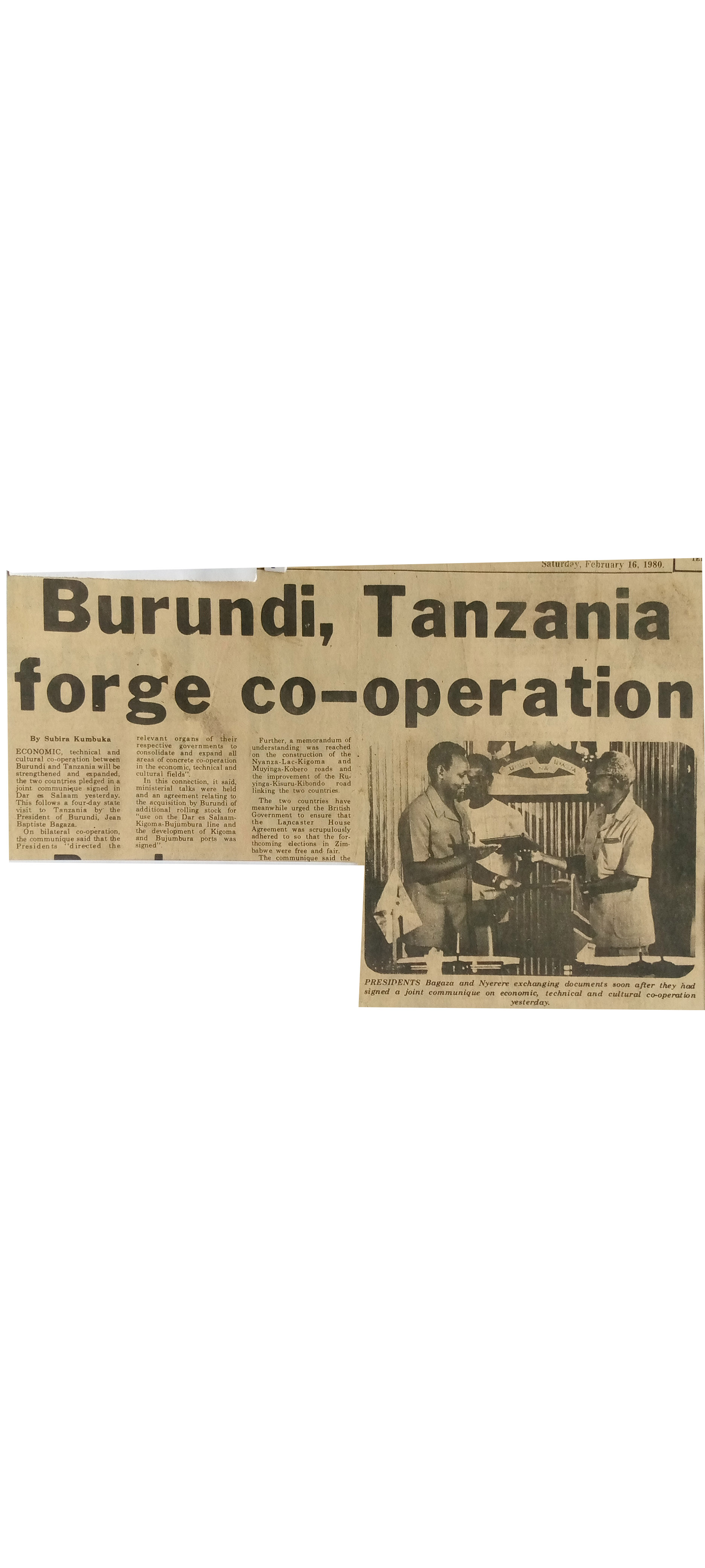 Burundi,Tanzania forge co-operation (1980,February 16) Daily News.pp.1