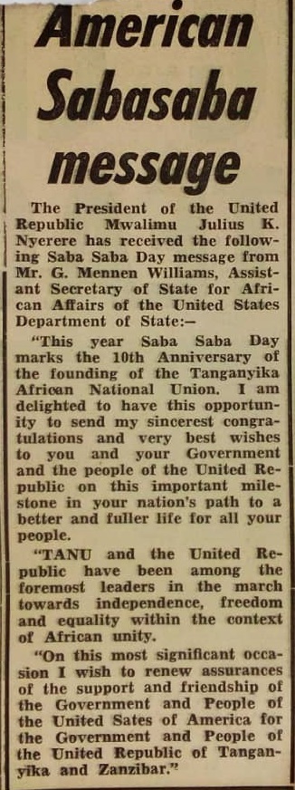 The President of the United Republic Mwalimu Julius K. Nyerere has received the Saba Saba Day message from Mr. G Mennen Williams, Assistant Secretary of State for African Affairs of the United States Department of State