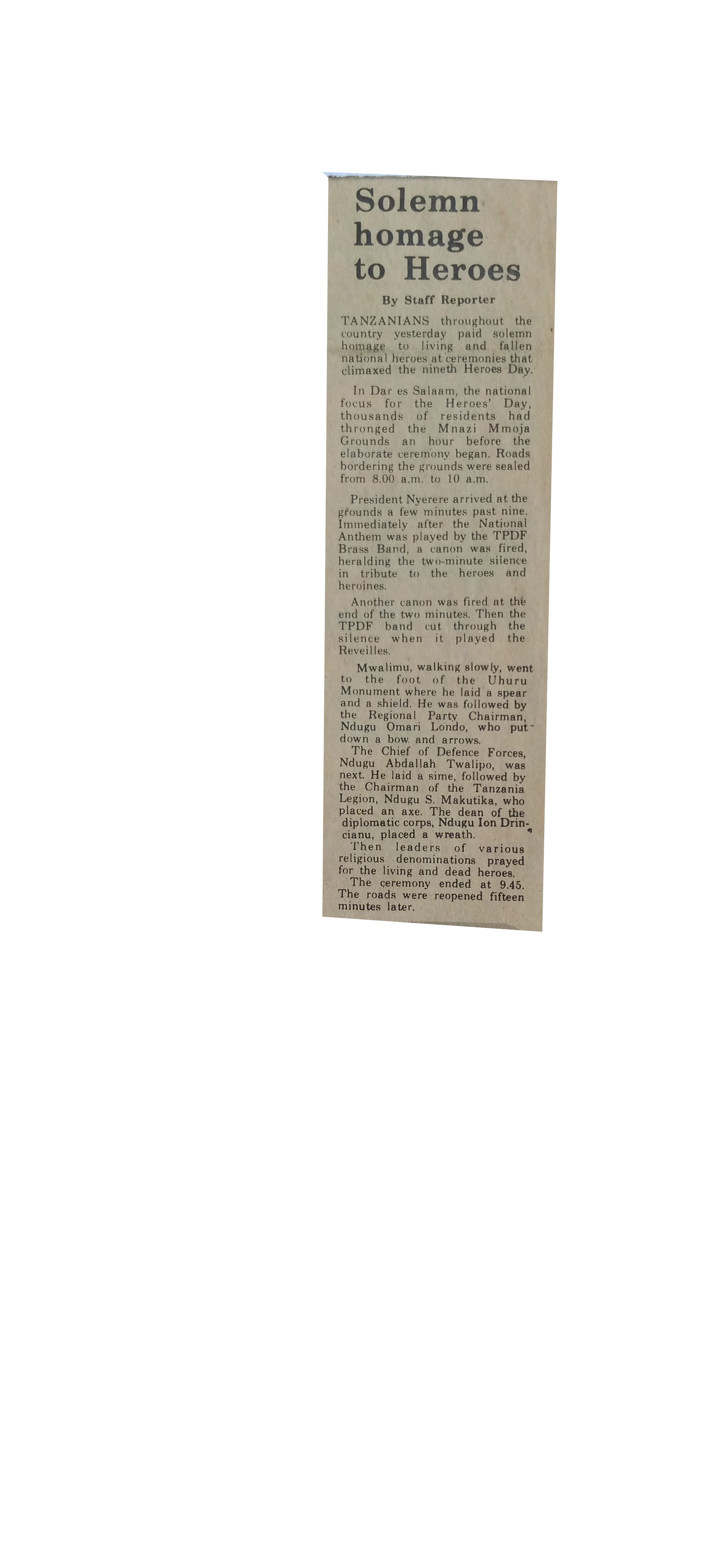 Tanzanians through the country yesterday paid solemn homage to living and fallen national heroes at ceremonies that climaxed the nineth Heroes Day.