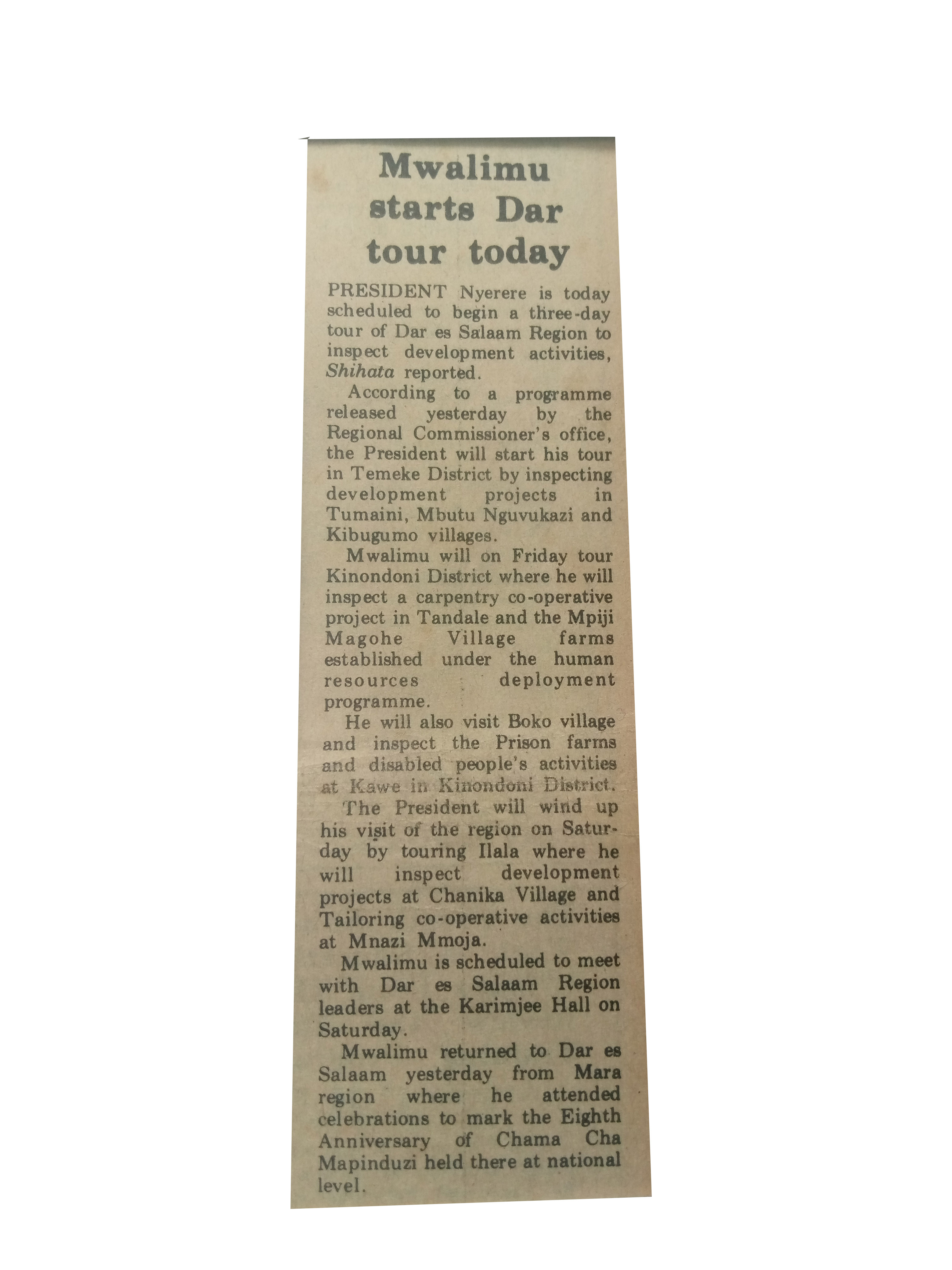 | dc.description.abstract | President Nyerere is today scheduled to begin a three-day tour of Dar es Salaam Region to inspect development activities shihata reported. | en_US |