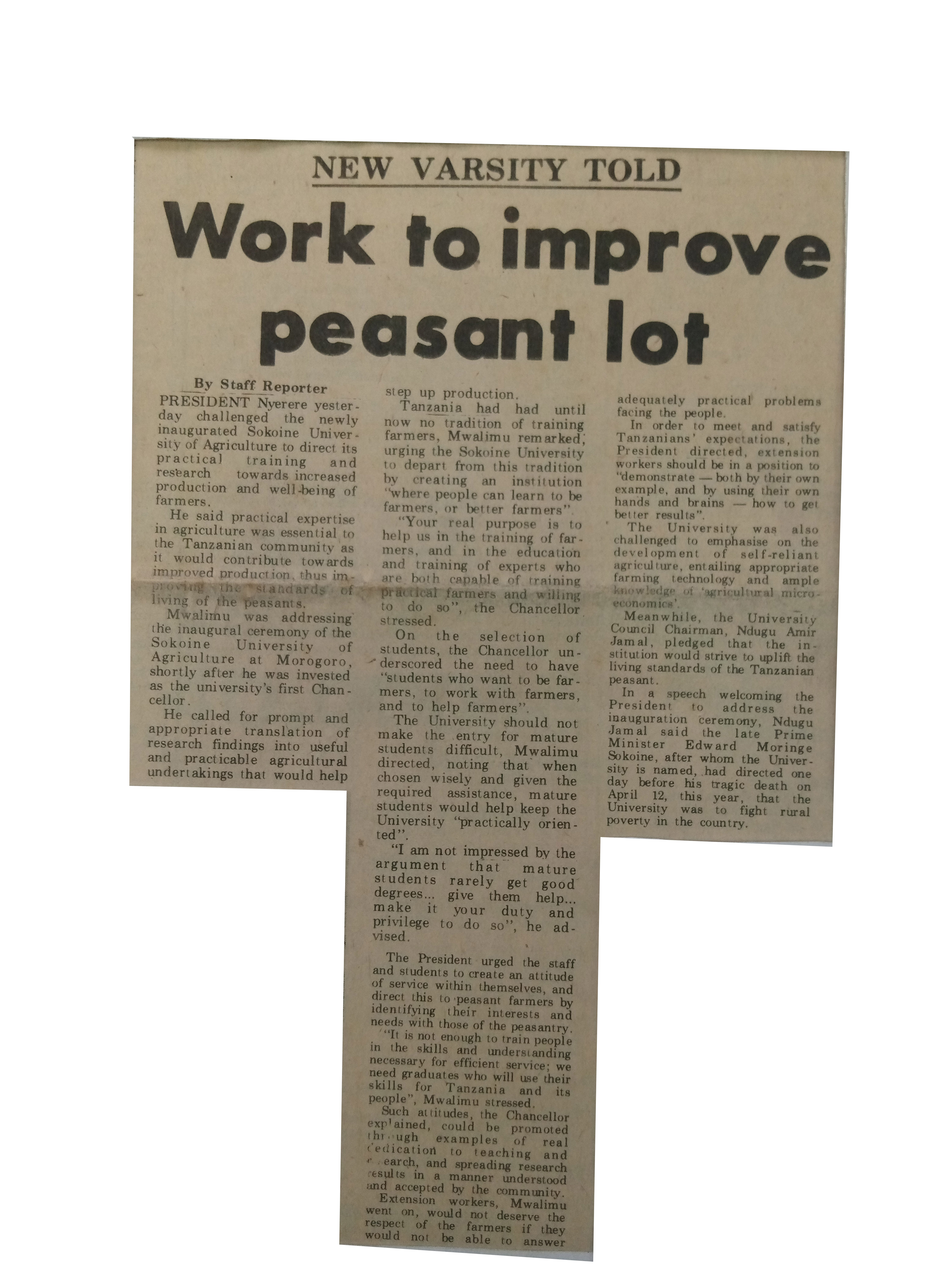 President Nyerere yesterday challenged the newly inaugurated Sokoine University of Agriculture to direct its practical training and research towards increased production and well being of farmers.