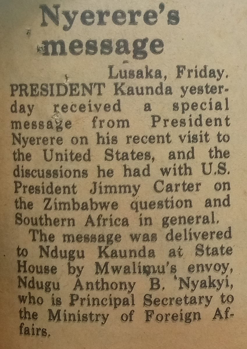 President Kaunda yesterday received a special message from president Nyerere on his recent visit to the United State, and the discussion he had with U.S. president Jimmy Carter on the Zimbabwe question and Southern Africa in general