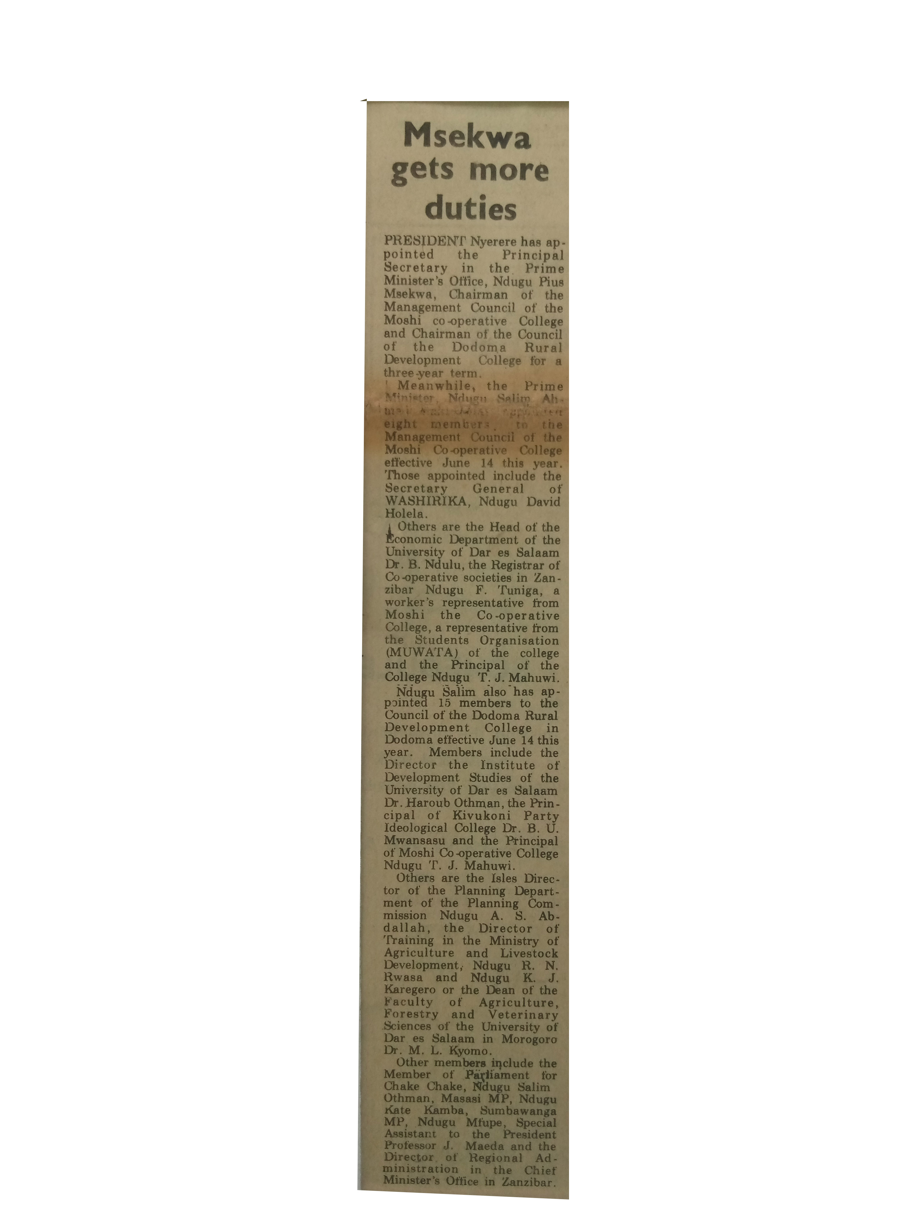 | dc.description.abstract | President Nyerere has appointed the Principal Secretary in the Prime Ministers's Office,Ndugu Pius Msekwa ,Chairman of the Management Council of the Moshi Co-operative Collage and Chairman of the Council of the Dodoma Rural Development College for three-years term. | en_US |