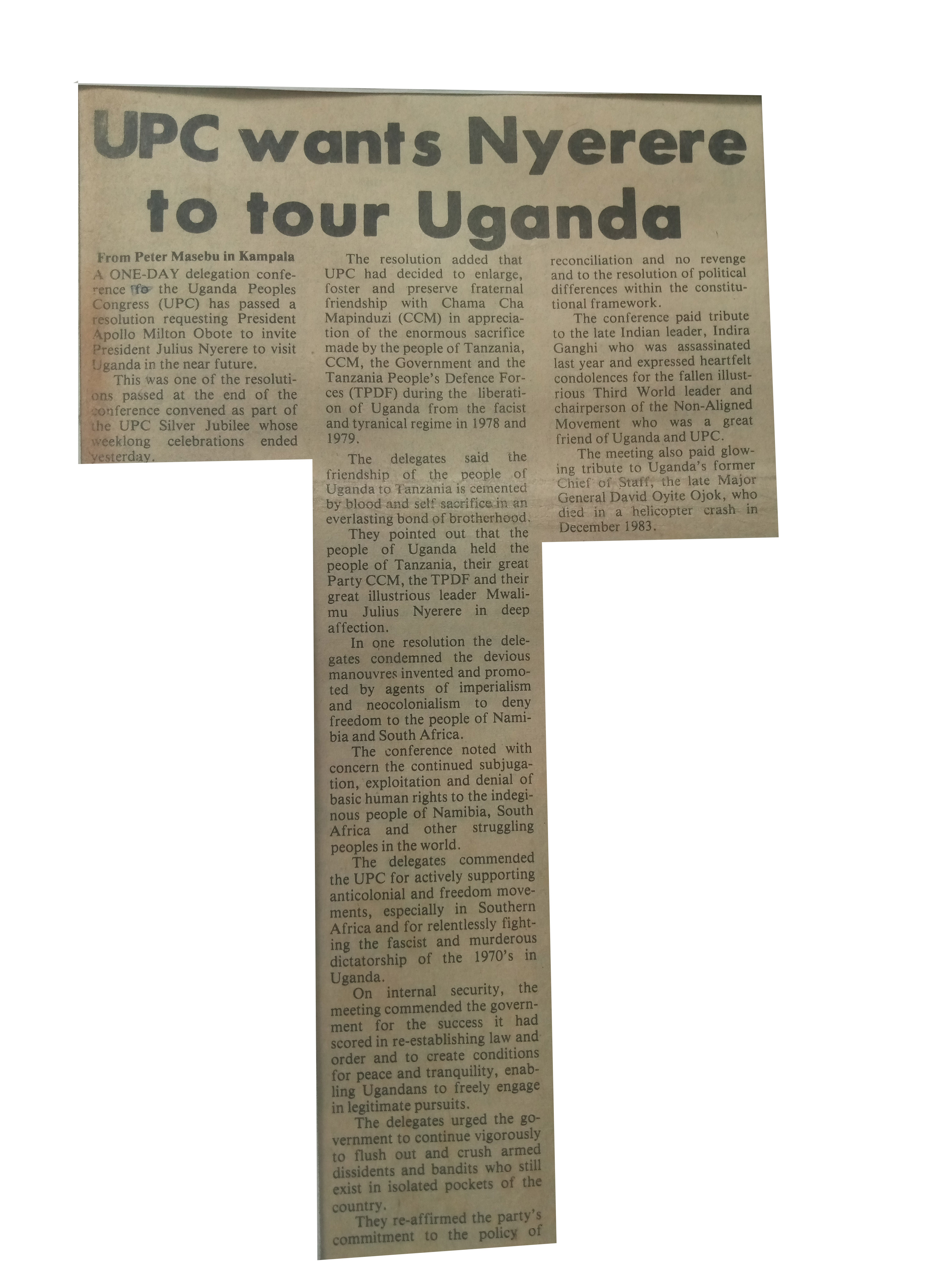 UPC wants Nyerere to tour Uganda (1985, March 11). Daily News, pp.1