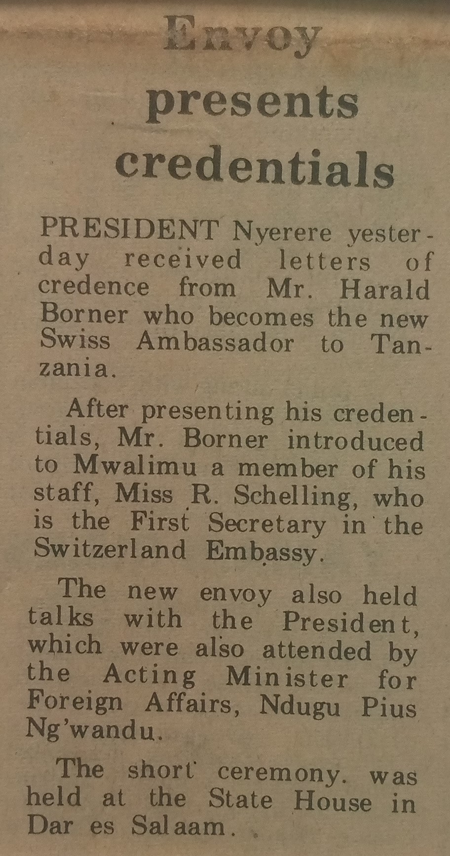 | dc.description.abstract | President Nyerere yesterday received letters of credence from Mr. Harald Borner who becomes the new Swiss Ambassador to Tanzania. | en_US |