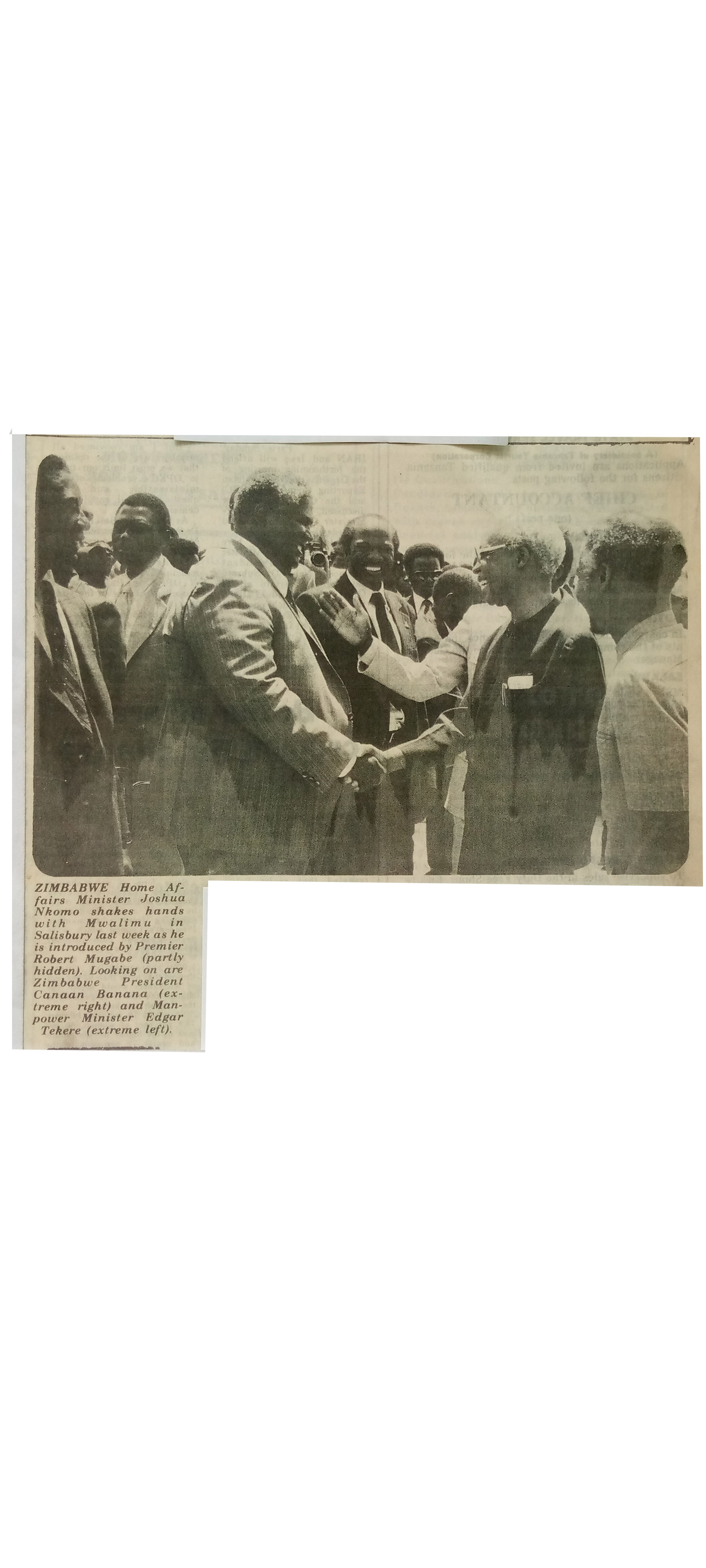 Zimbabwe Home Affairs Minister Joshua Nkomo shakes hands with Mwalimu in Salisbury last week as he is introduced by Premier Robert Mugabe.