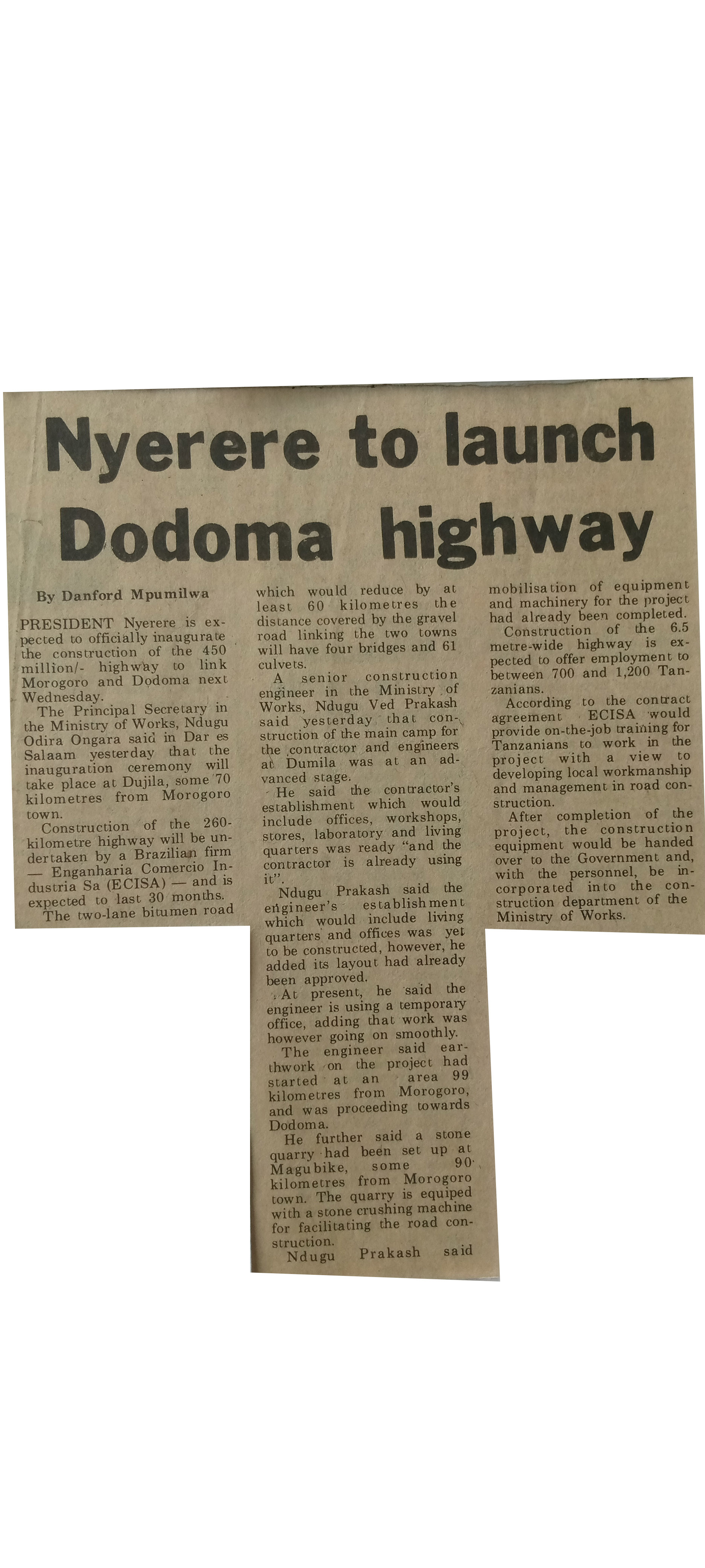 Nyerere to launch Dodoma high way (1980, August 23) Daily News, pp.1