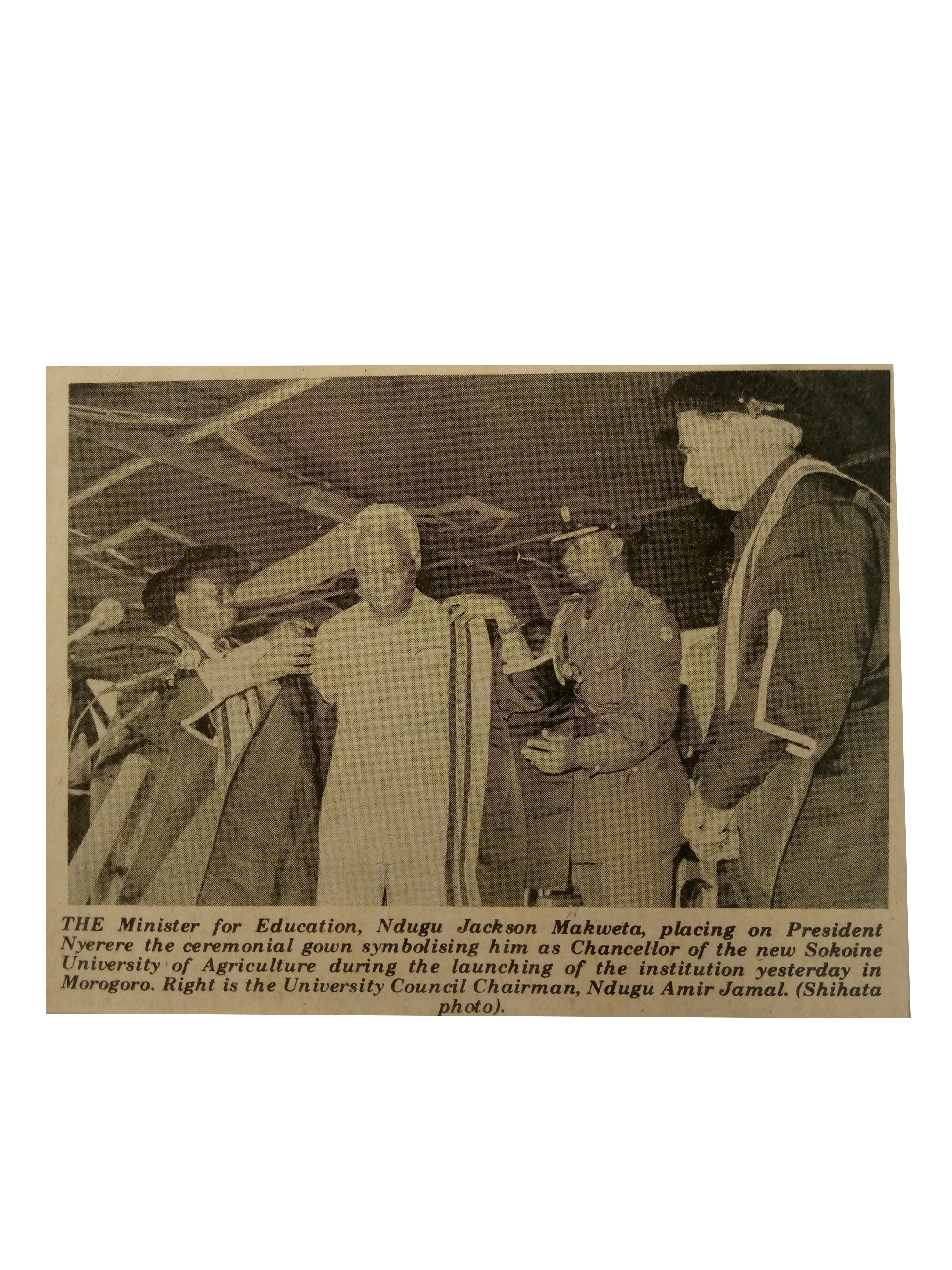 The Minister for Education placing on President Nyerere the ceremonial gown symbolizing him as Chancellor of the new Sokoine University of Agriculture (1984,September 27) Daily News.pp.1