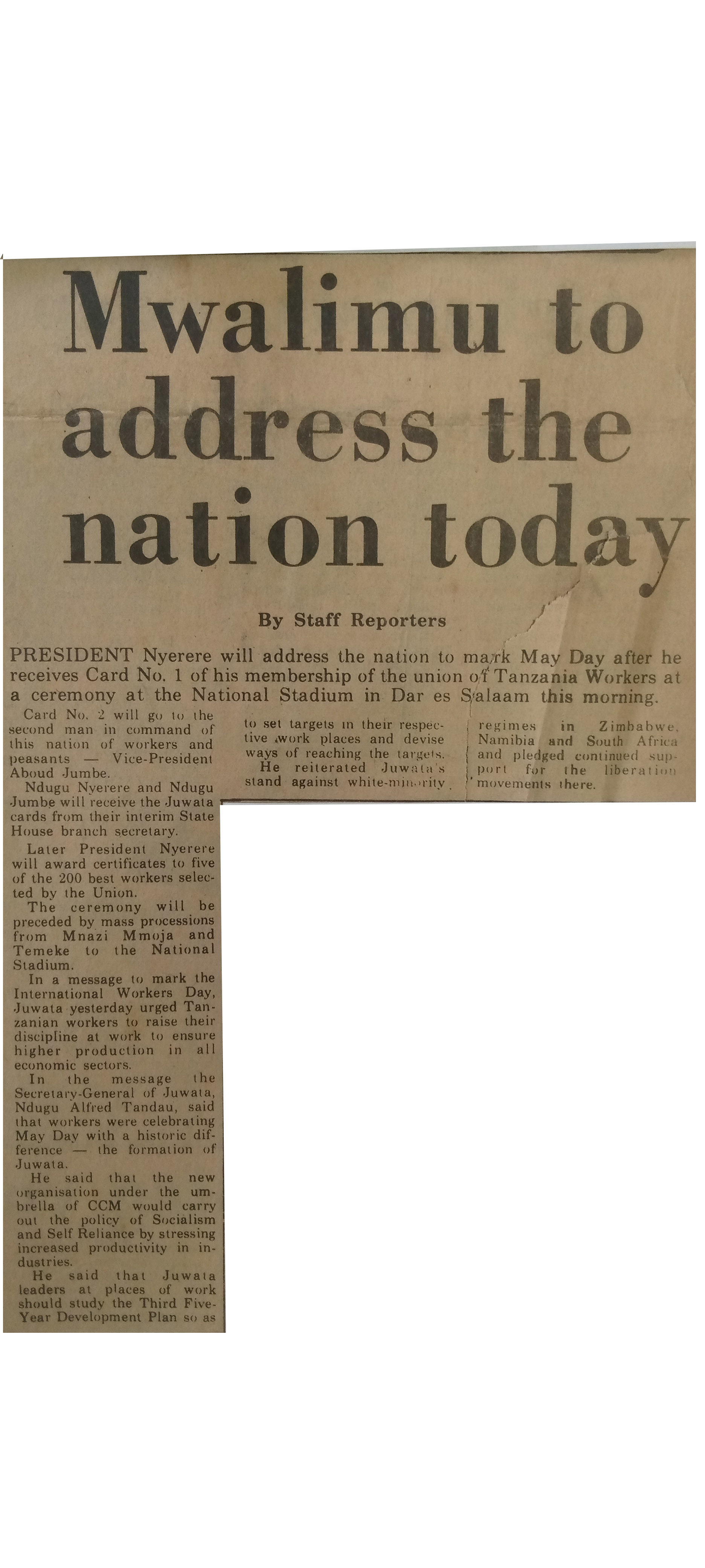 Mwalimu to address the nation today (1978,May 1).Daily News,pp.1
