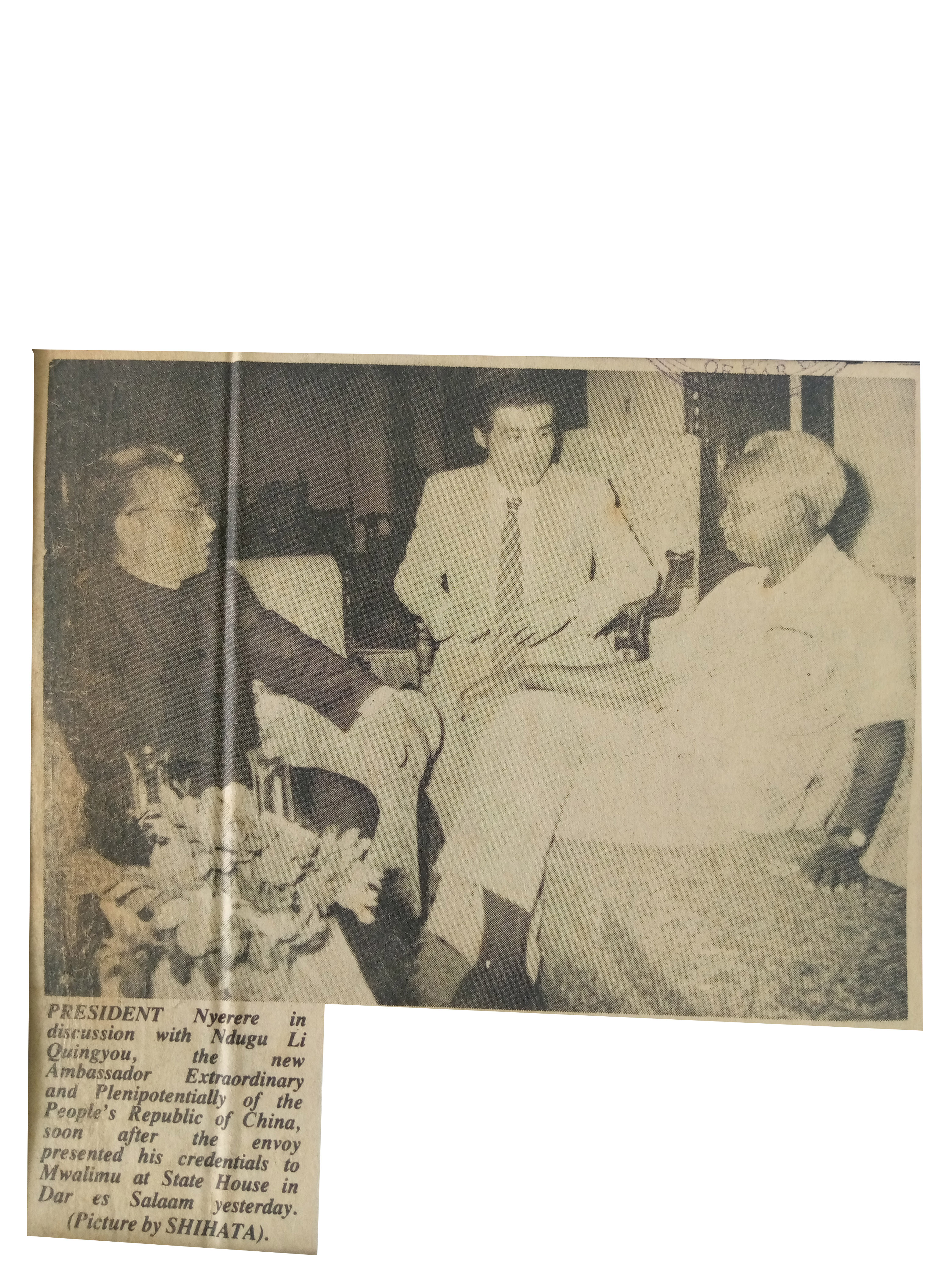 President Nyerere in discussion with Ndugu Li Quingyou ,the new Ambassador Extraordinary and Plenipotentiary of the People's Republic of china,soon after the envoy Presented his credentials to Mwalimu at State House in Dar es Salaam yesterday.