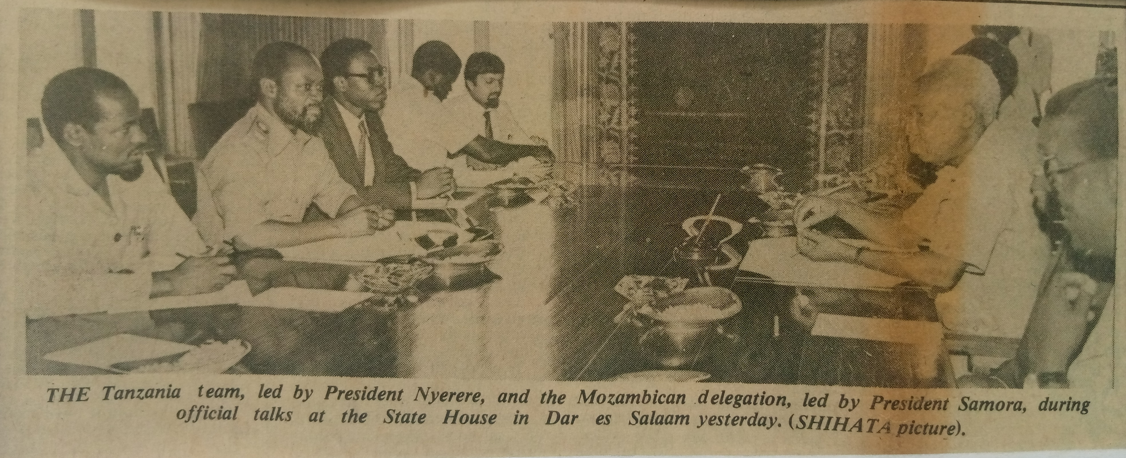 The Tanzanian team, led by President Nyerere, and the Mozambican delegation, led by president Samora, during official talks at the state house in Dar es Salaam.