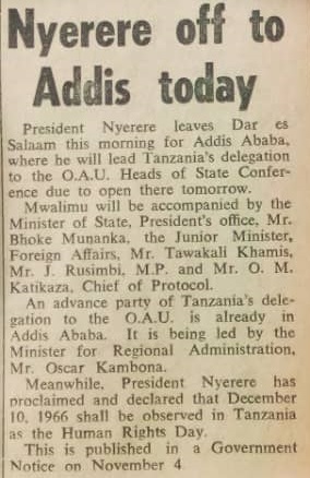 | dc.description.abstract | President Nyerere leaves Dar es salaam this morning for Addis Ababa, where he will lead Tanzania's delegation to the O.A.U. Heads for state conference due to open there tomorrow. | en_US |