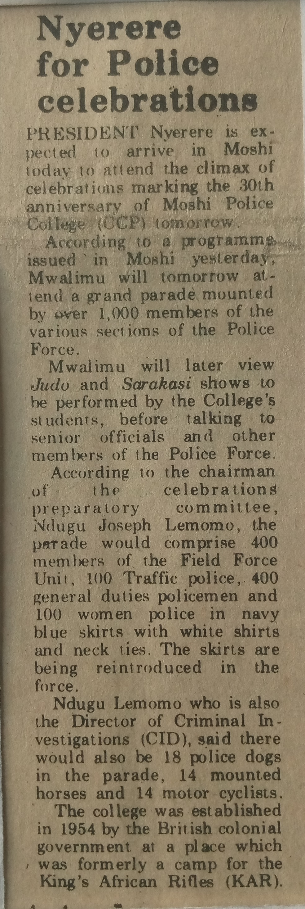 Nyerere for police celebrations (1984,August 10) Daily News ,pp.1