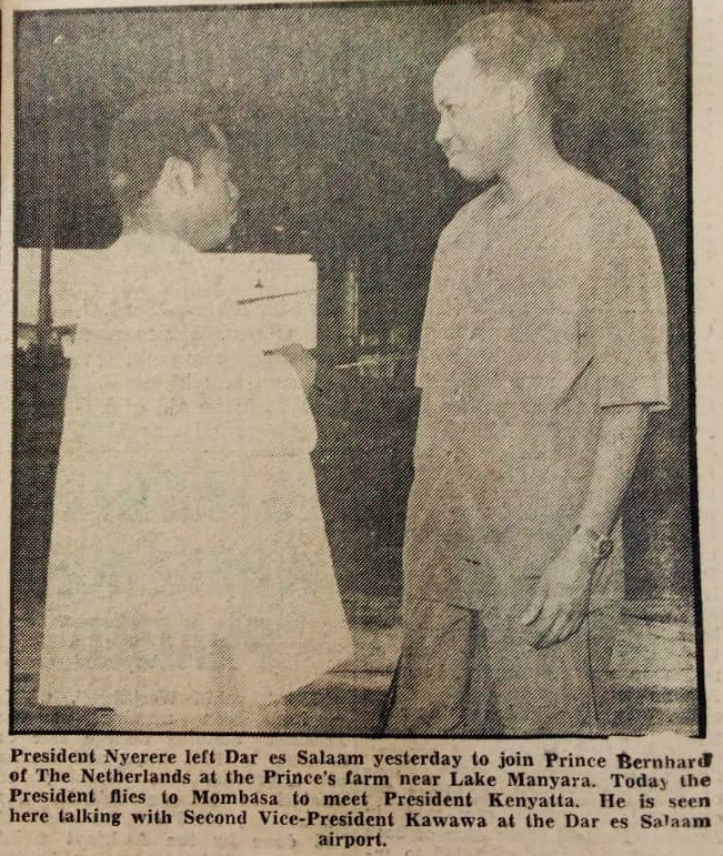 President Nyerere left Dar es salaam to join Prince Bernhard of the Netherlands at the Prince's farm near Lake Manyara.