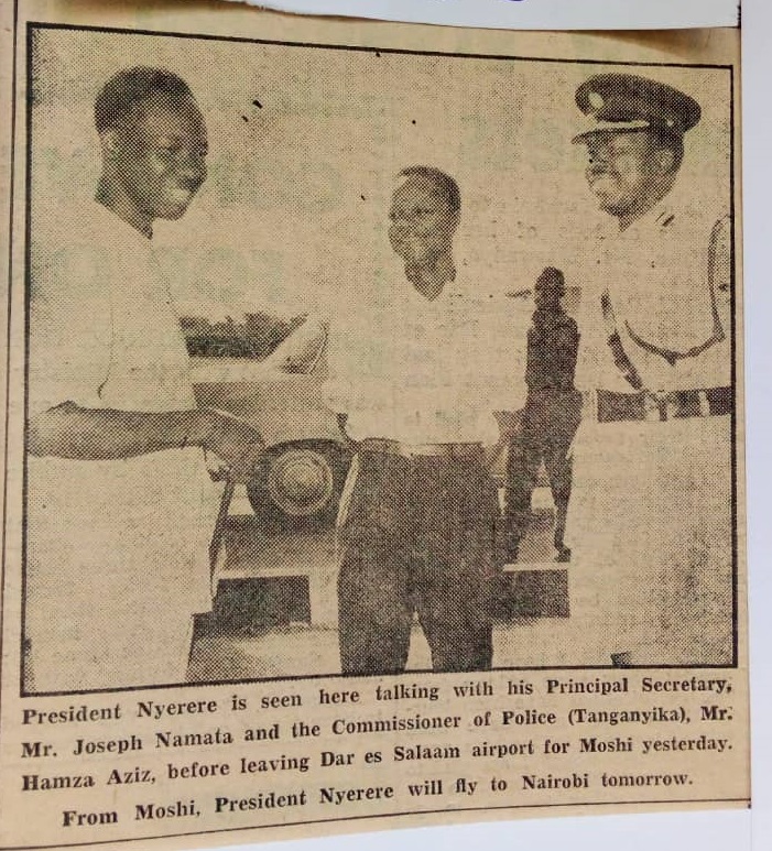 President Nyerere is seen here talking with his Principal Secretary,Mr.Joseph Namata and the Commissioner of police(Tanganyika),Mr.Hamza Aziz,before leaving Dar es Salaam airport for Moshi yesterday.