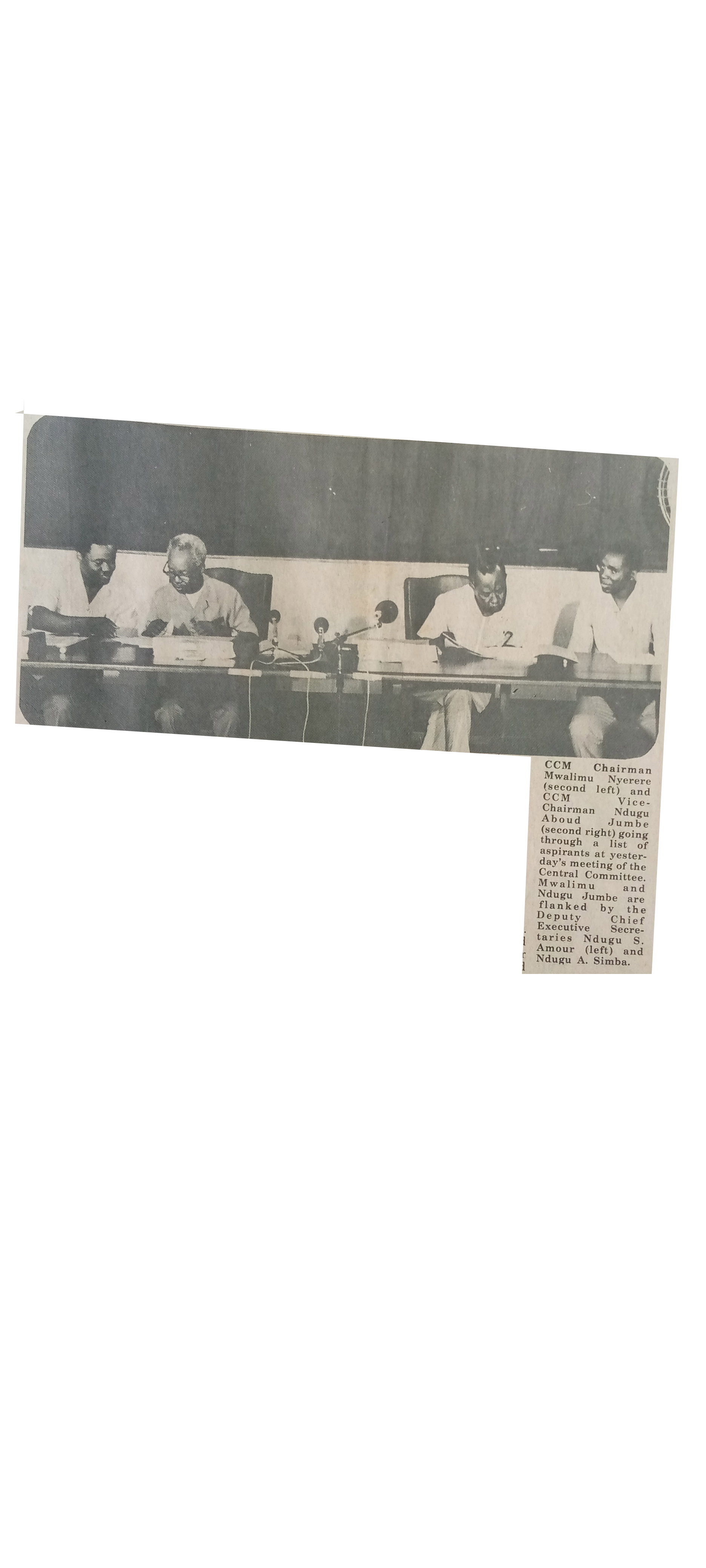 CCM Chairman Mwalimu and CCM Vice Chairman Ndugu Aboud Jumbe going through the list of aspirants at the meeting of the central committee.