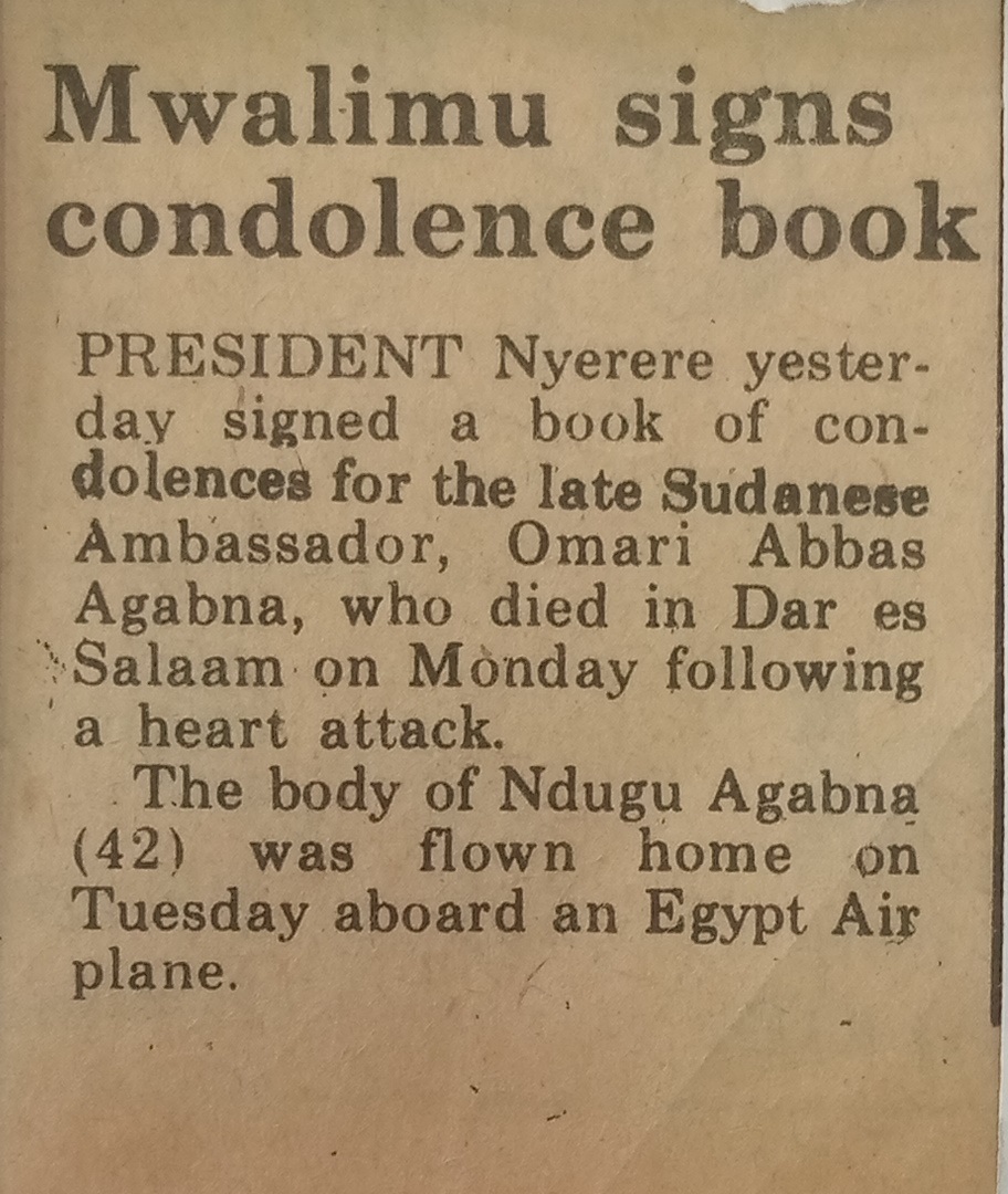 | dc.description.abstract | President Nyerere yesterday signed a book of condolences for the late Sudanese Ambassador,Omari Abbas Agabna,who died in Dar es Salaam on Monday following a heart attack. | en_US |