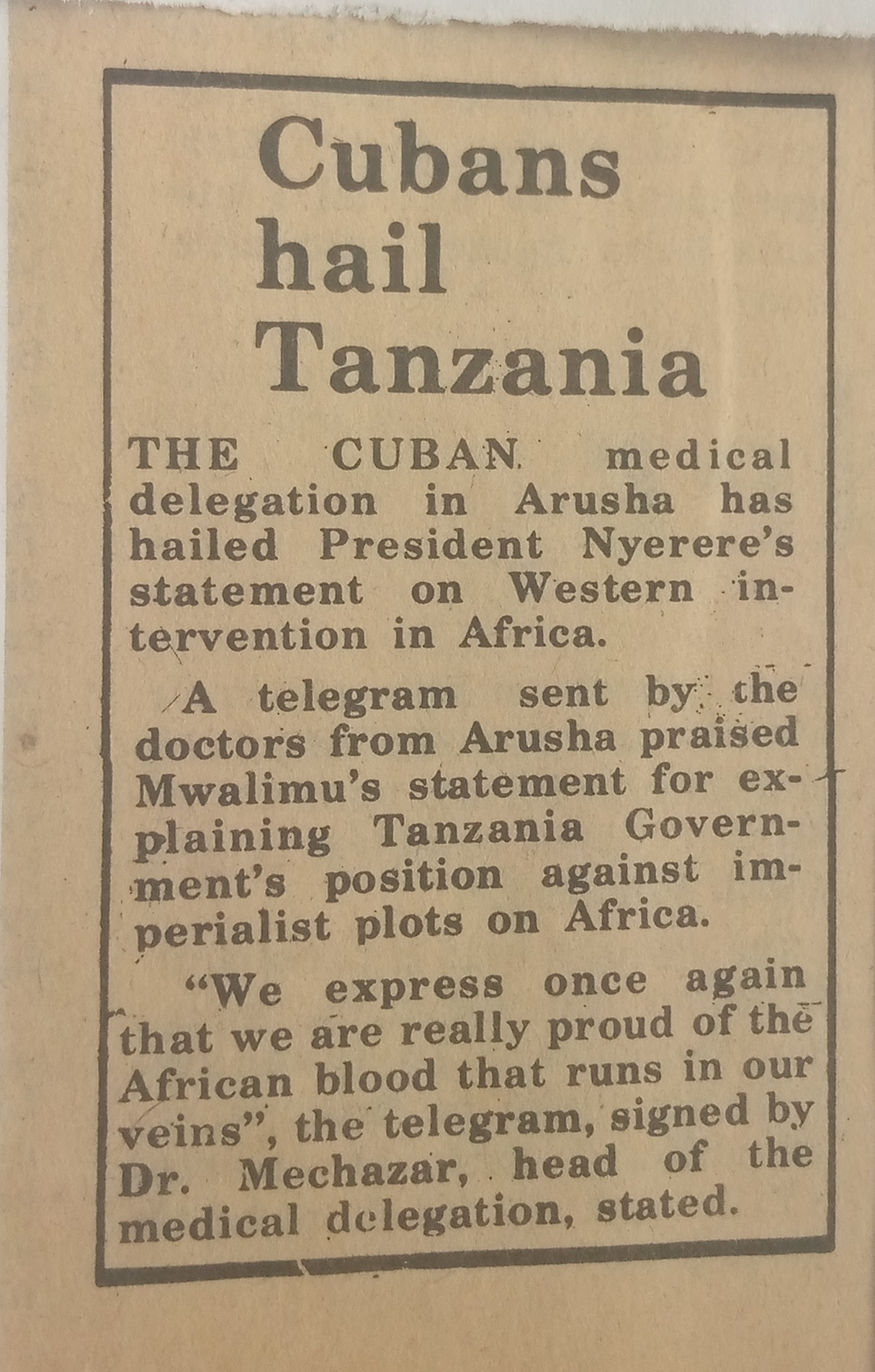 The Cuban medical delegation in Arusha has hailed President Nyerere's statement on Western intervention in Africa. A telegram sent by the doctors from Arusha praised Mwalimu's statements for explaining Tanzania Government position against imperialist plots on Africa.