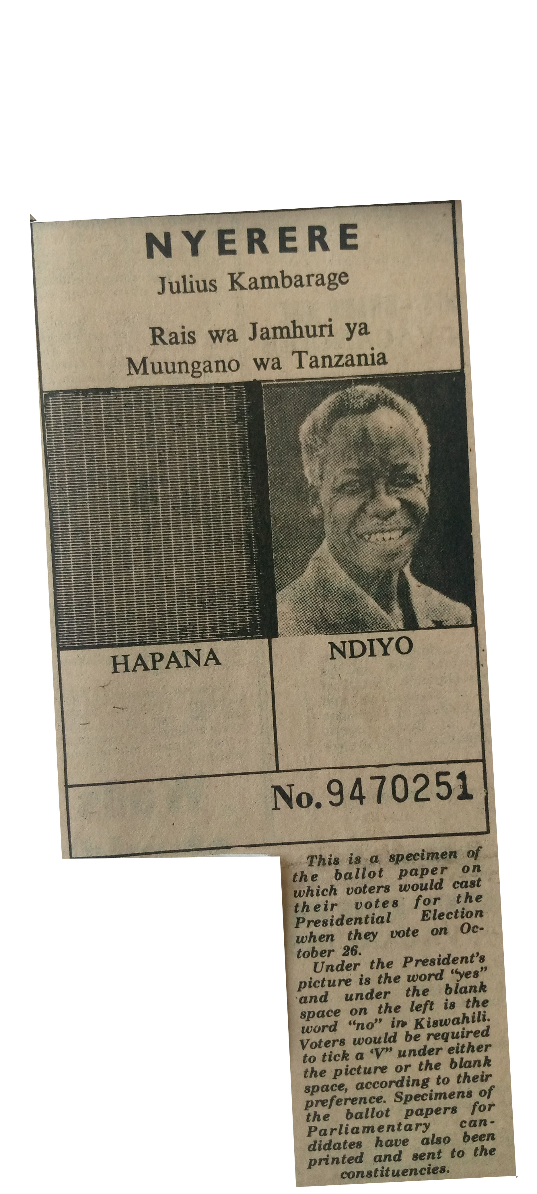 Nyerere Julius Kambarage: Rais wa Jamhuri ya Muungano wa Tanzania (1980, September 29). Daily News, pp1.