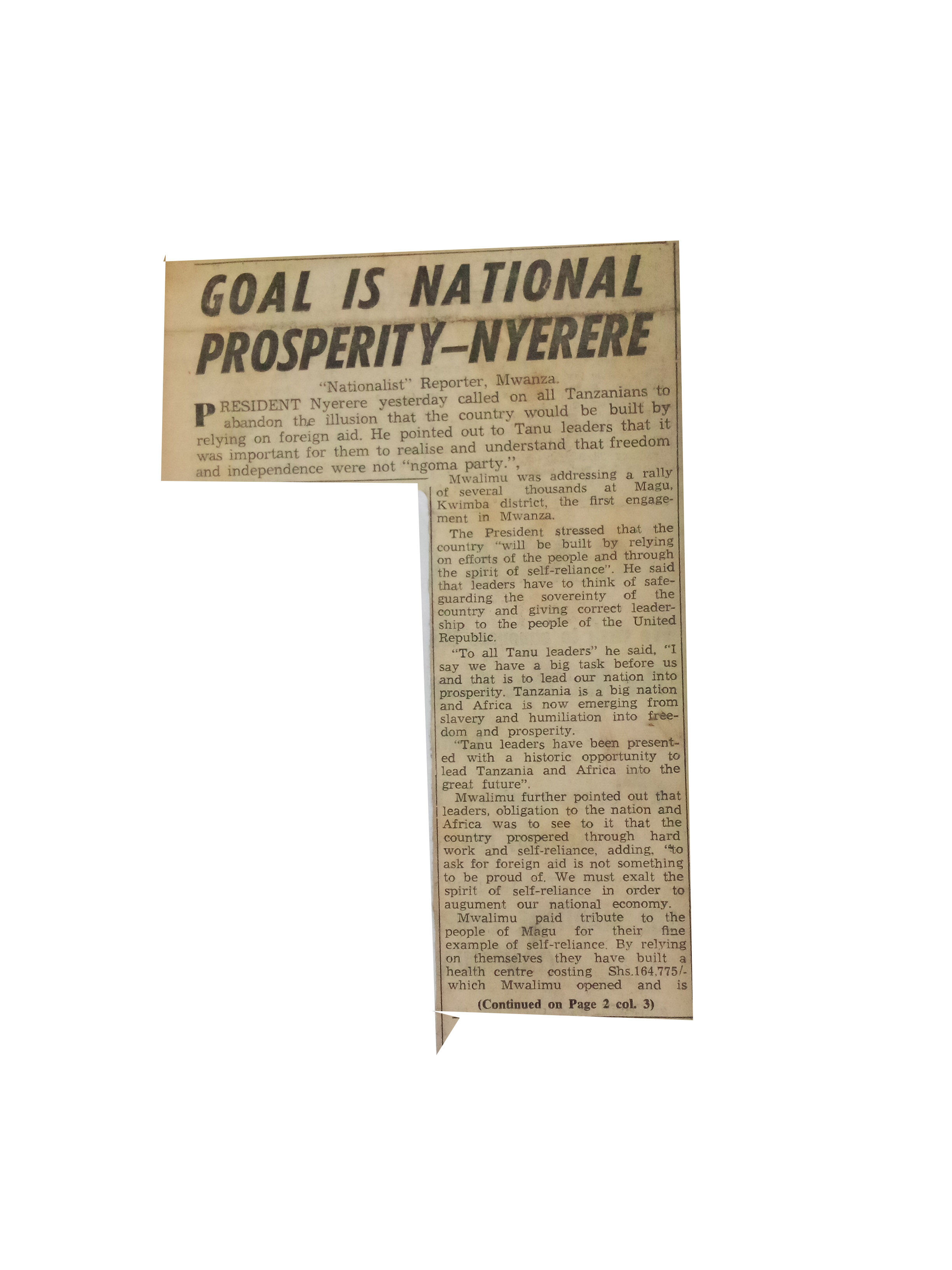 Goal is national prosperity - Nyerere (1957), The Nationalist.pp.1