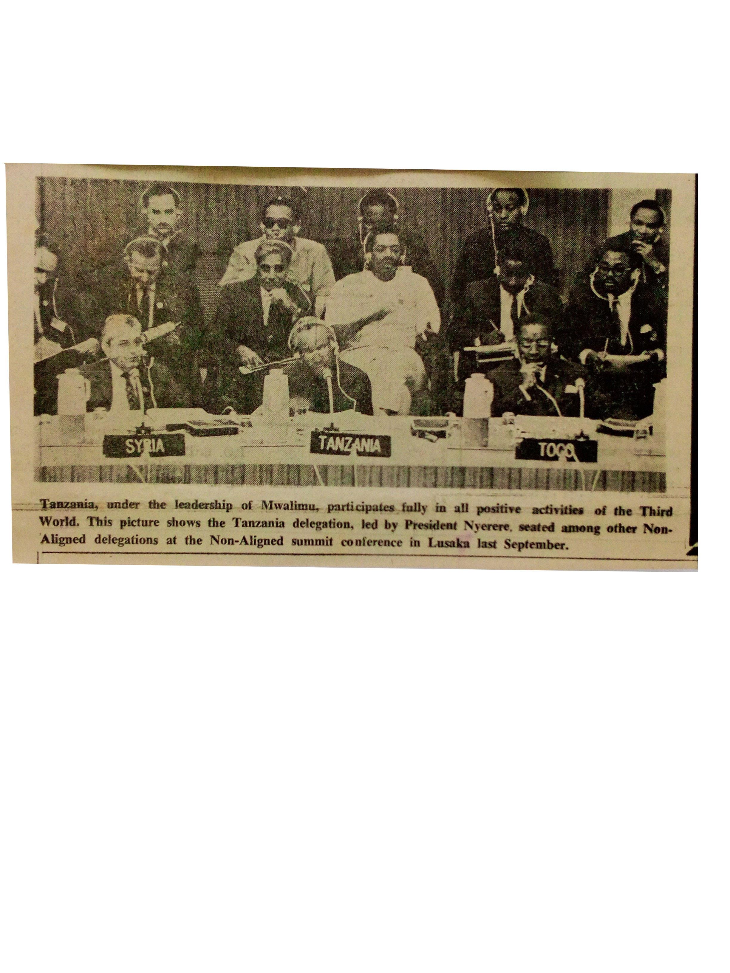 Tanzania under the leadership of Mwalimu, participates fully in all positive activities of the Third World. This picture shows the Tanzania delegation, led by President Nyerere, seated among other non aligned delegations at the non- aligned summit conference in Lusaka